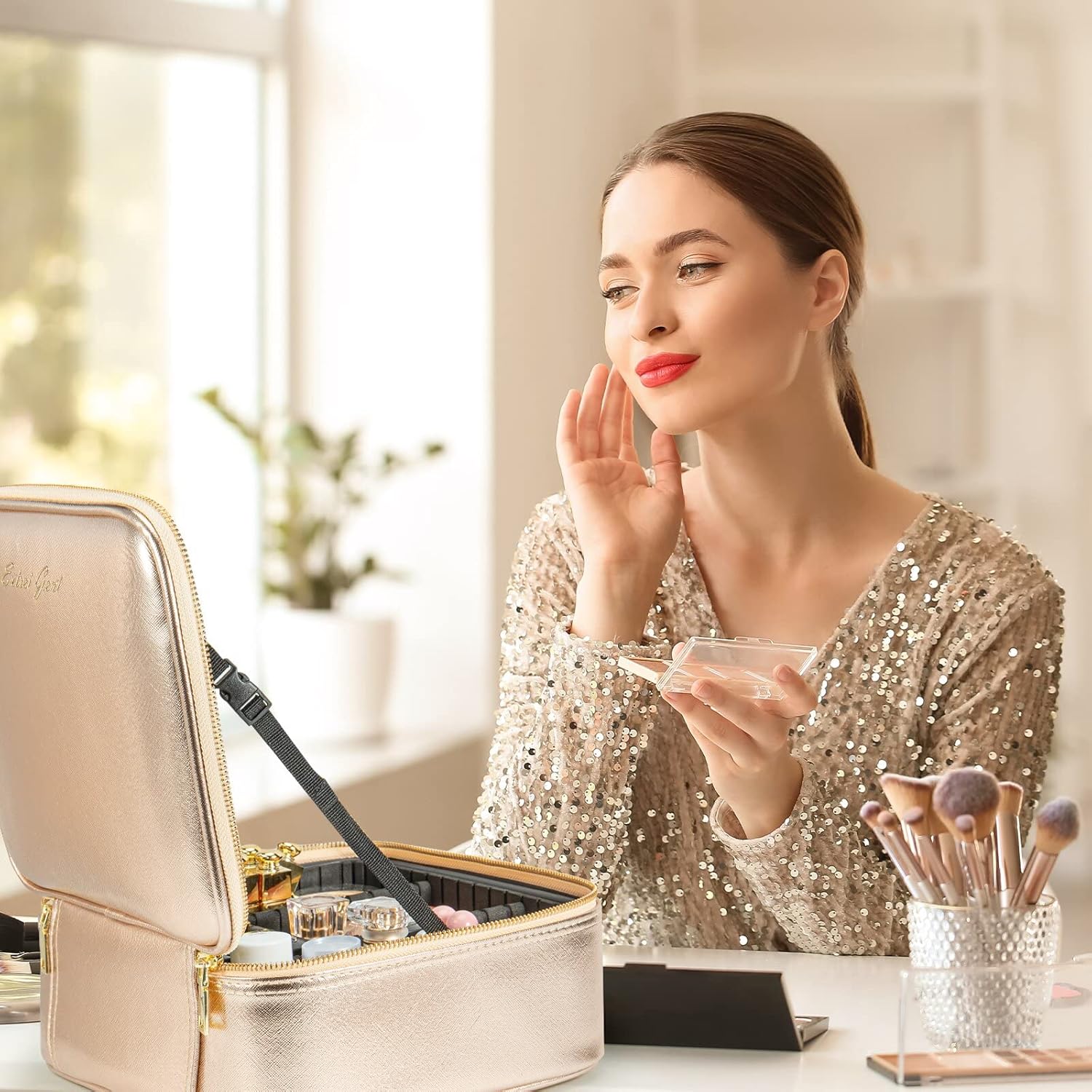 - 【Premium Material】The vanity case is made of delicate synthetic leather surface, waterproof and wear-resistant, ergonomic handle, electroplated light gold zipper is anti-corrosion, not easy to fade.
