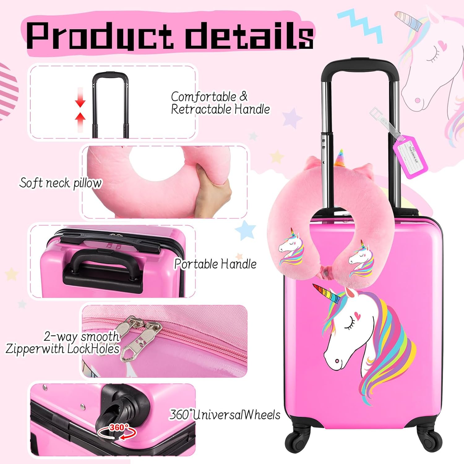 Sanwuta 4 Pcs Kids Luggage Set Kids Backpack Travel Rolling Suitcase with Wheels U-shape Pillow Childrens Gift for Girls Boys(17 Inch,Unicorn Style,Pink)