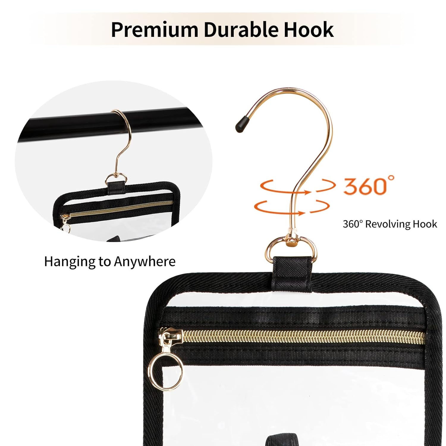 - 360° Mental Hanging Hook —— The hook design allows you to place your toiletries in a room that without enough space. Hanging the toiletry bag to anywhere you want with the 360° large hook. The large hook makes the placing unlimited. You can hang it on the door, wardrobe or shelf.