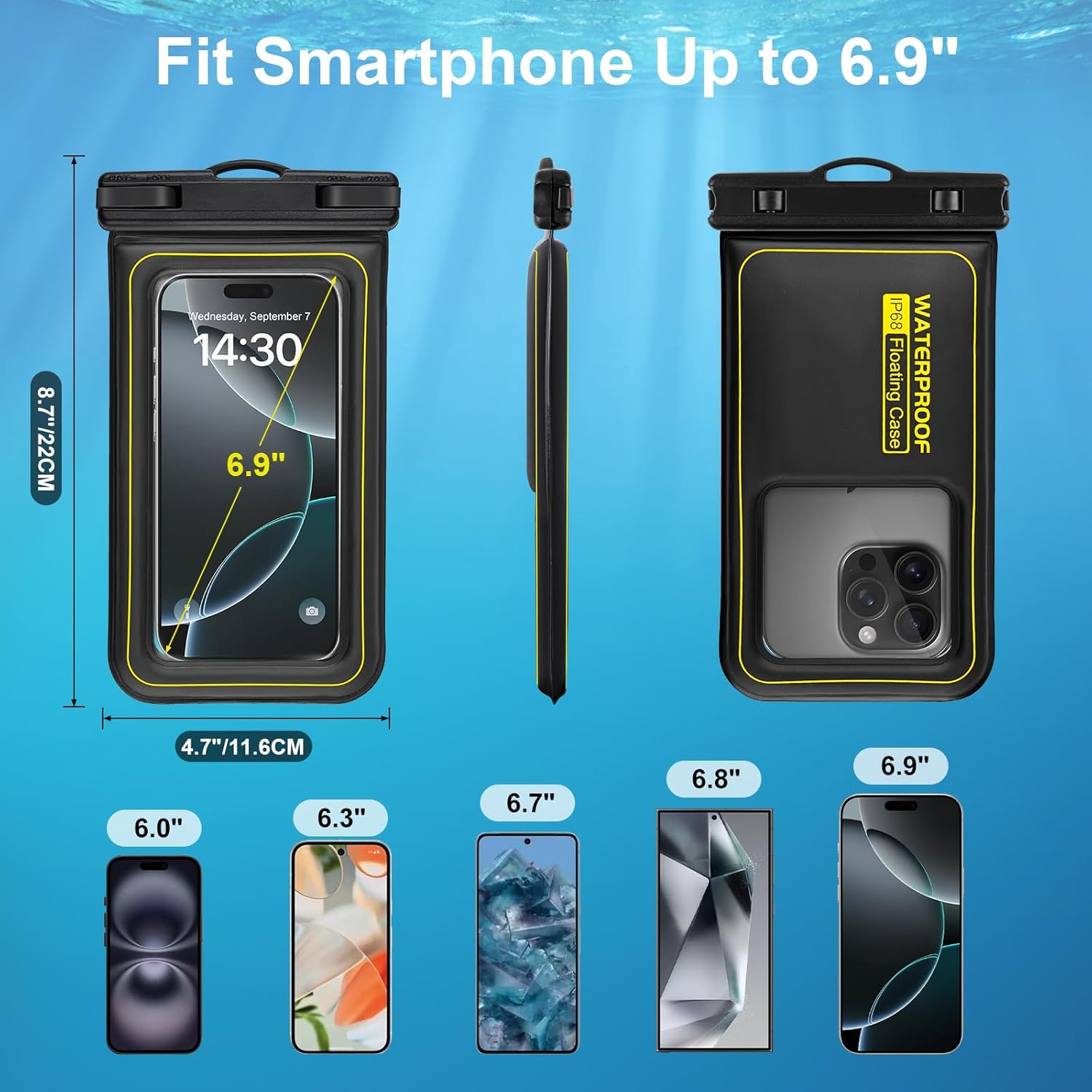 - IP68 Waterproof Protection & Floating: IP68 waterproof certificated, provides water/sand/snow/dust protection for your phone. Built-in upgraded high-density sponge cushions, twice the buoyancy & impact resistance for your device to float in the water, One of the best travel essentials for beaches, pools, swimming, rafting, surfing, fishing, sailing, diving, boating, kayaking, snorkeling, tubing, and more indoor and outdoor activities.(Best for Phone Screen Sizes Up to 7 Inches)