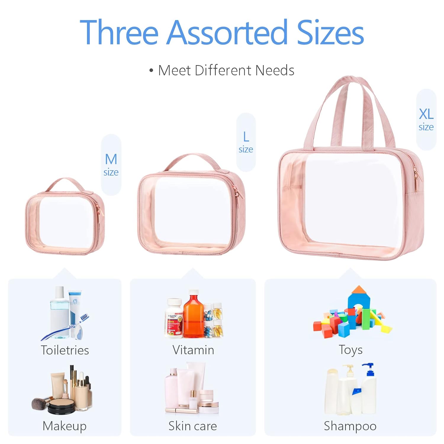 PACKISM Clear Toiletry Bags, 3 Pack Clear Makeup Bags with Handle Large Opening, Waterproof Cosmetic Bags Fit Carry-on Travel Essentials, Travel Bags, Pink