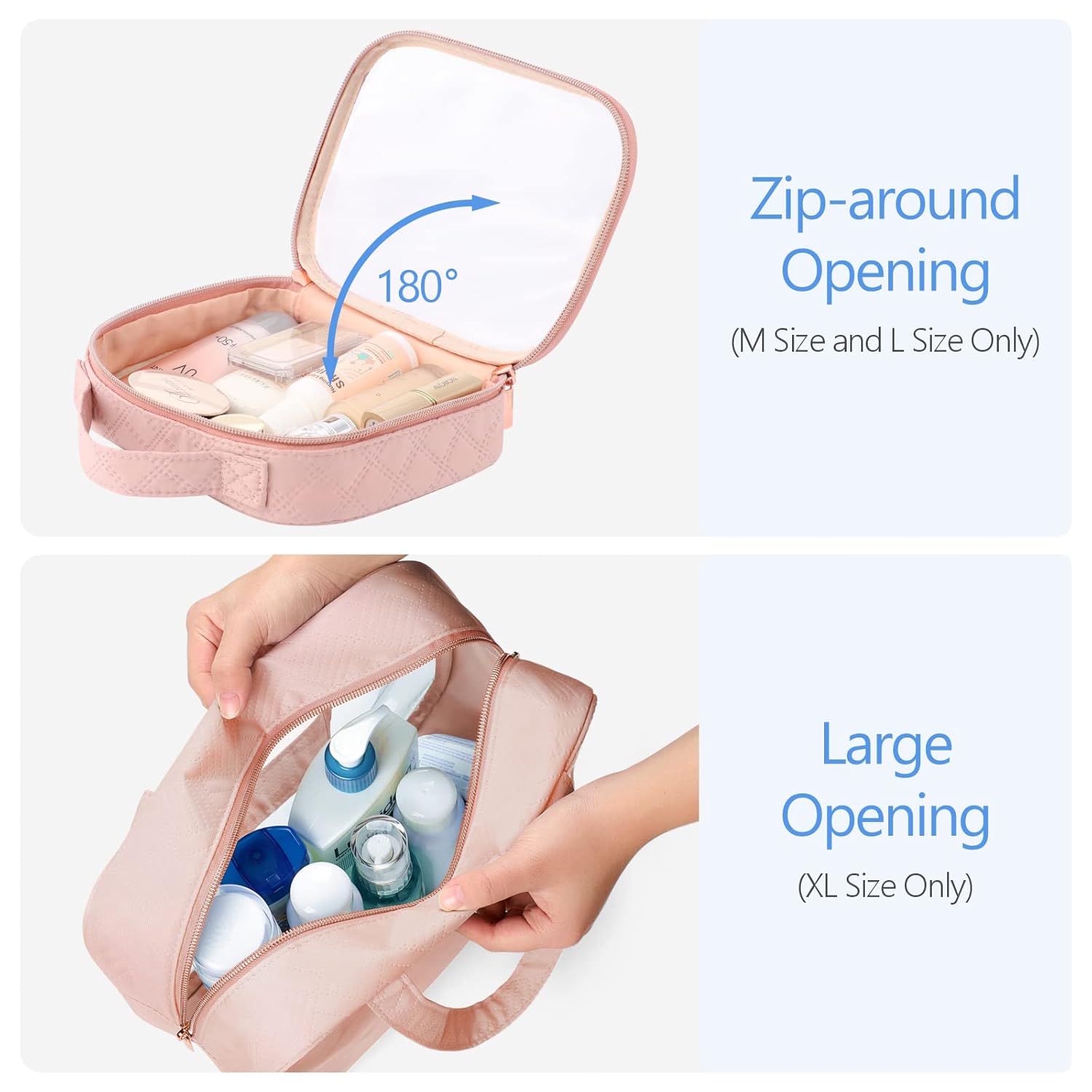 - Easy to Use: Zip-around opening facilitates the access of travel essentials. Double zippers can be opened by 180%, so the clear makeup bags can be opened horizontally. And the humanized handle design allows this makeup bag to be lifted and hung, convenient to use
