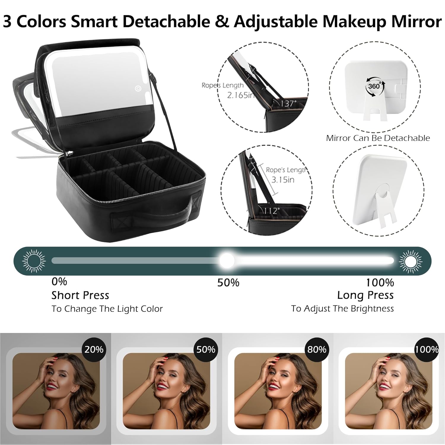 MOMIRA Travel Makeup Bag Cosmetic Bag Makeup Organizer Bag with Lighted Mirror, Adjustable Brightness in 3 Color Scenarios, Waterproof Makeup Train Case, Gift for Women - Woven black