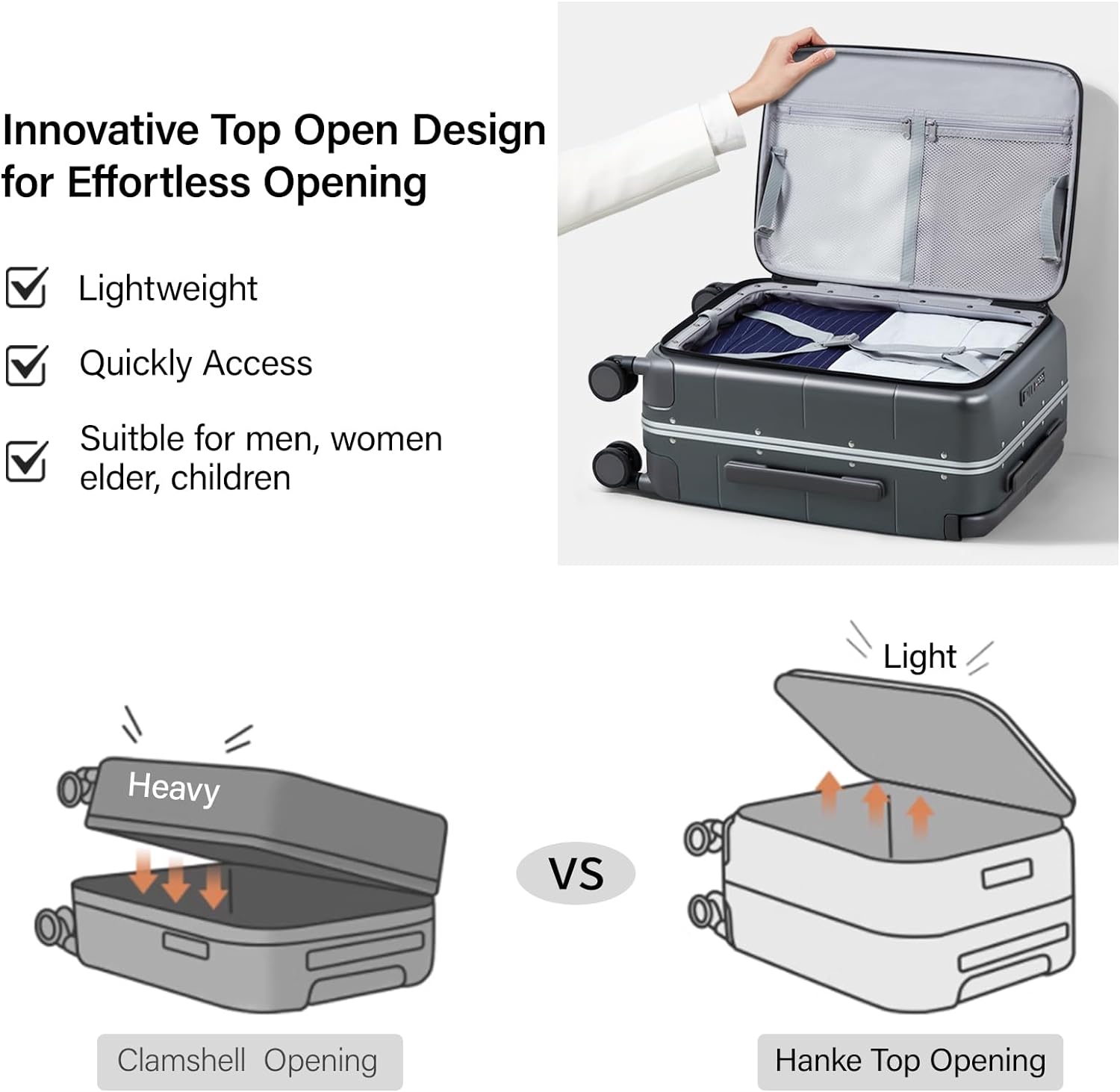 - Aluminum Frame & 3-Layer 100% PC Hard Shell: Hanke wide handle luggage reinforce with built-in aluminum alloy frame (non-removable) to resist impacts.The shatterproof material prevents cracking. Lightweight yet 30% tougher than standard carry-on suitcase materials – perfect for rough baggage handling