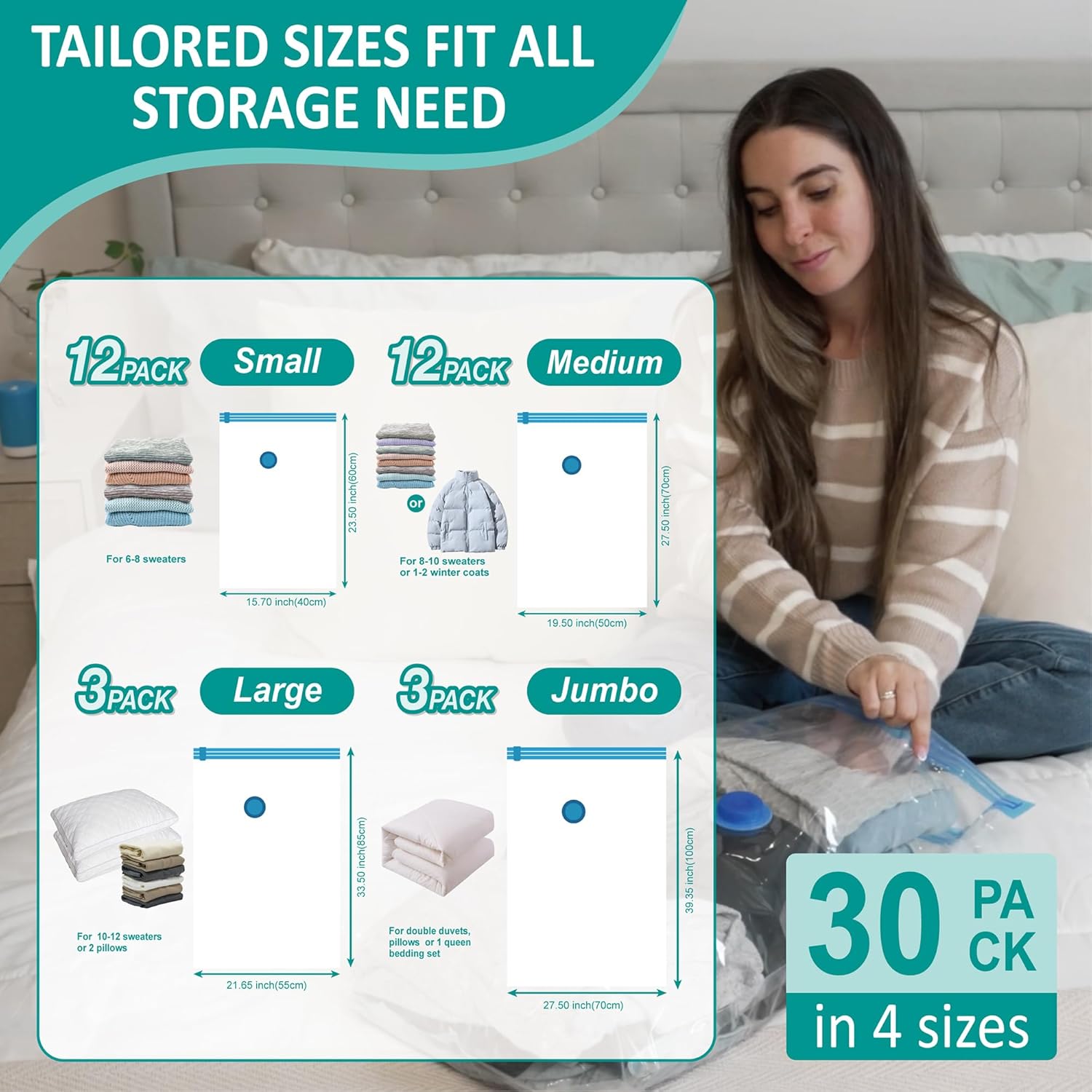 - 30 Combo includes: Our 30 pack space saver bags pack comes with 3 Jumbo: 39.35β X 27.5β(100cm X 70cm); 3 Large: 33.5β X 21.65β(85cm X 55cm); 12 Medium: 27.5βX 19.5β(70cm X 50cm); 12 Small: 23.5βX 15.7β (60cm X 40cm) and 1 electric air pump.