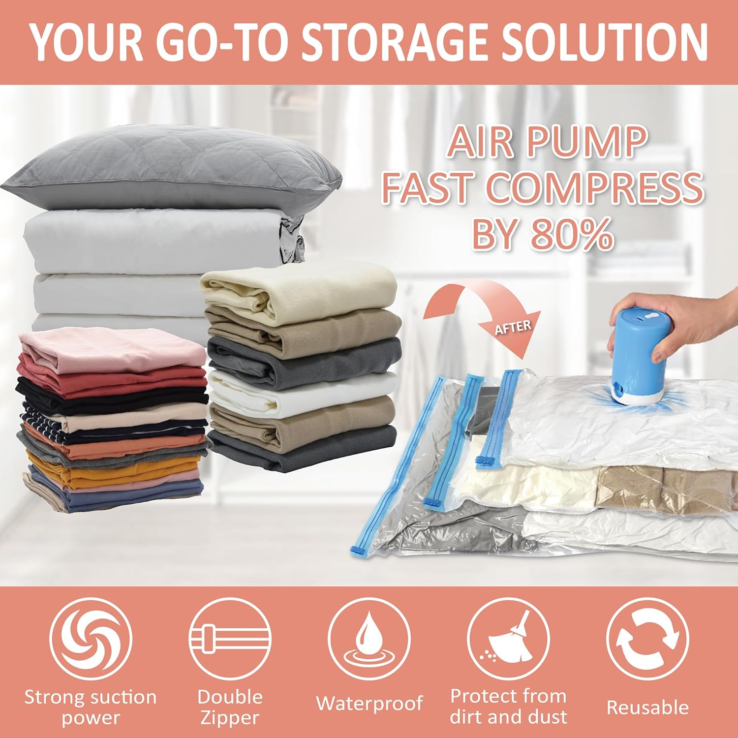 - Unlock your storage capacity with our electric pump vacuum storage bags: Our space saver bags increase your storage space by up to 80%. Utilize the electric pump to effortlessly compress clothes, duvets, pillows, bedding, and more into your wardrobe, suitcase, or underbed storage within minutes, guarding your items and keeping an organized space.