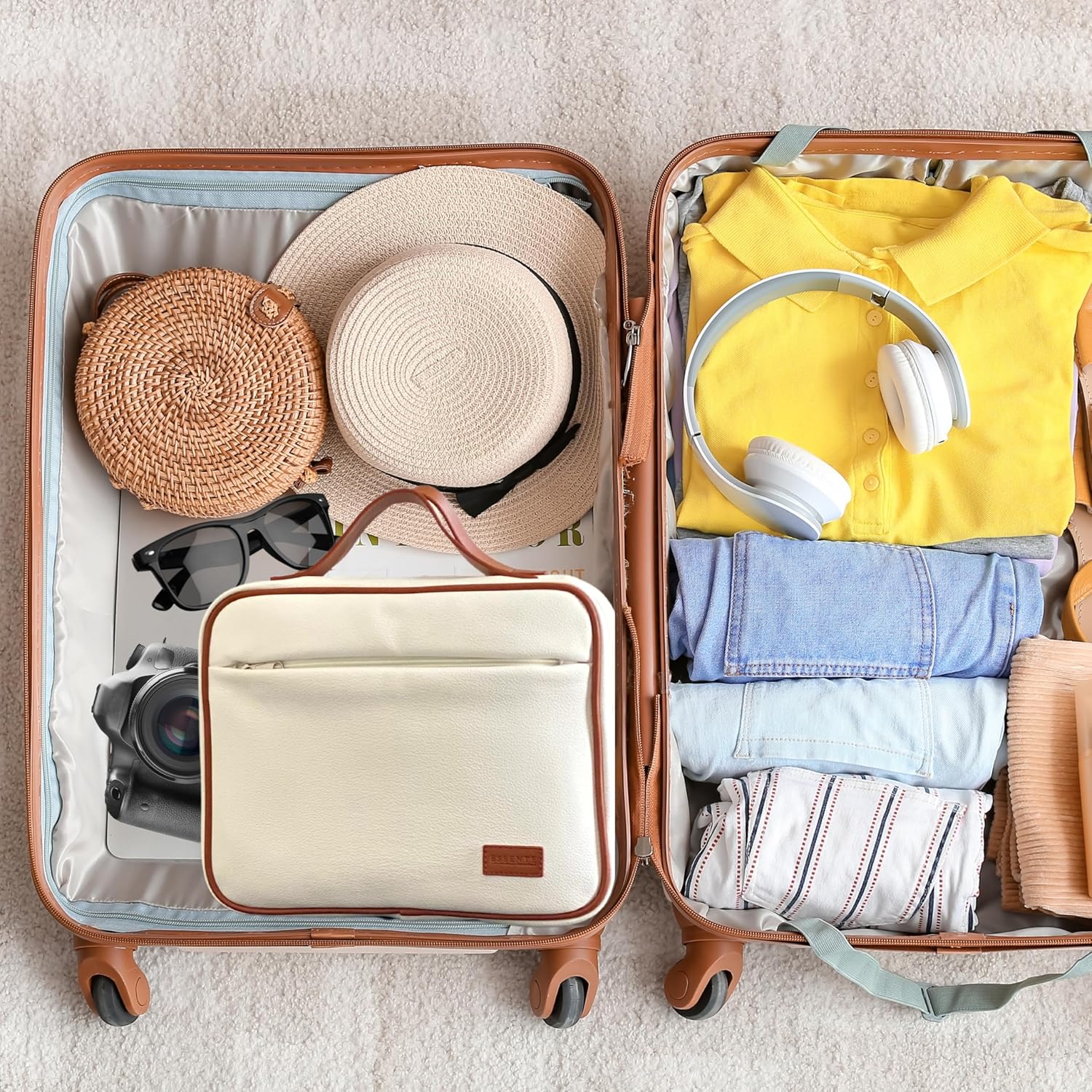 ESSENTE Women's Travel Toiletry Bag with Removable Pouch and Hanging Hook - Water Resistant Makeup Cosmetic Oraganizer with Multiple Compartments for Accessories (OFF WHITE FAUX LEATHER)