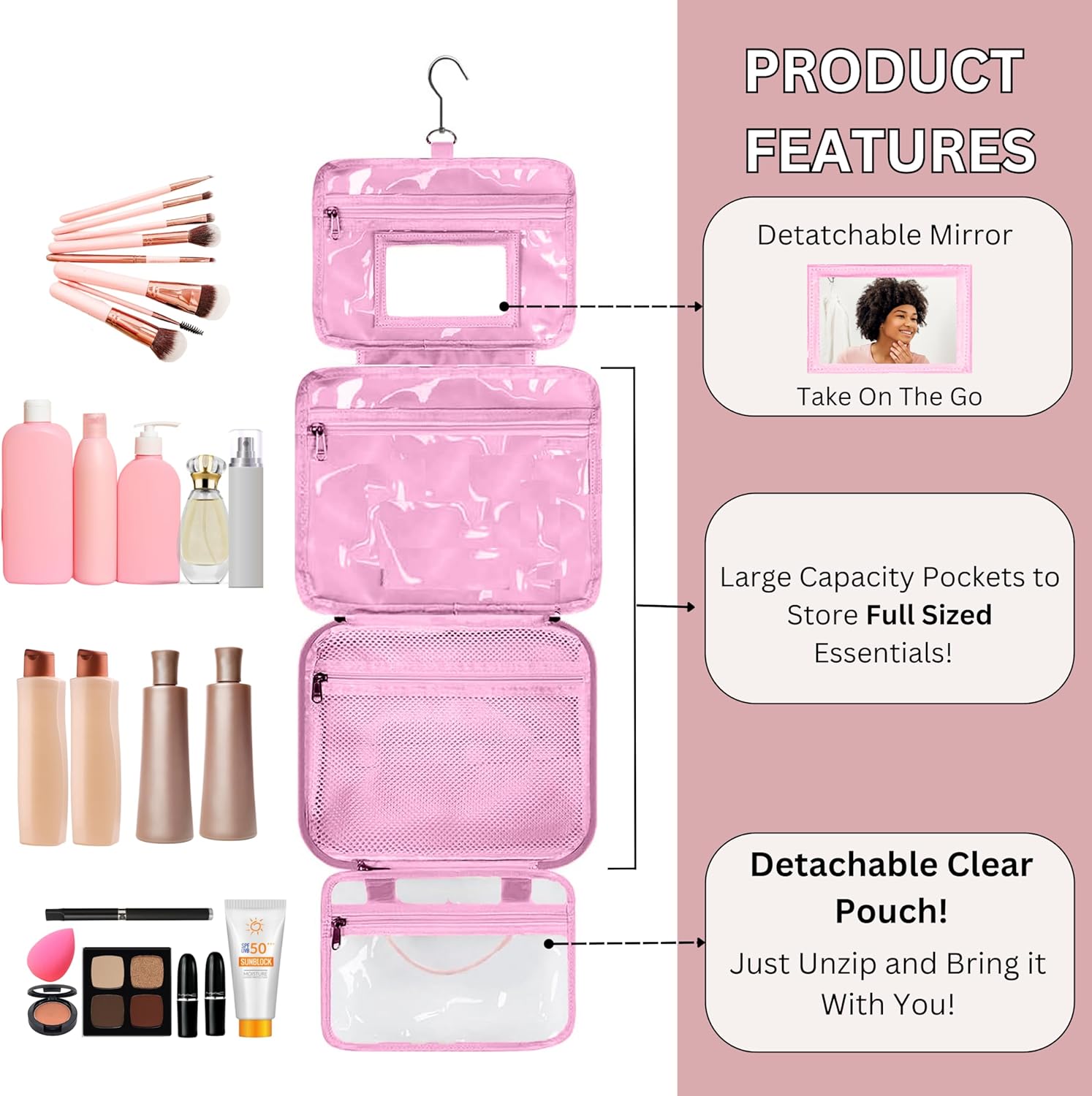 ESSENTE Women's Travel Toiletry Bag with Removable Pouch and Hanging Hook - Water Resistant Makeup Cosmetic Oraganizer with Multiple Compartments for Accessories (PRETTY IN PINK)