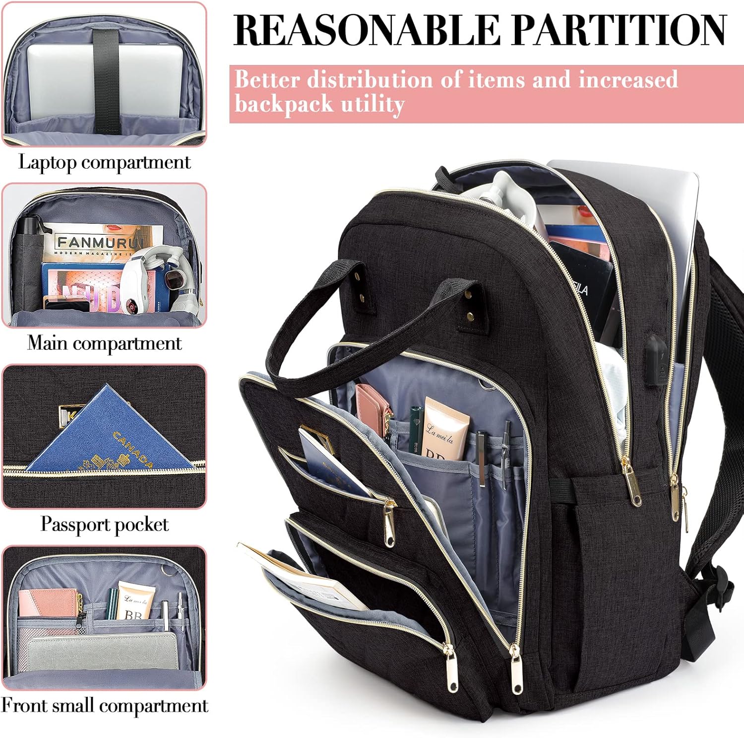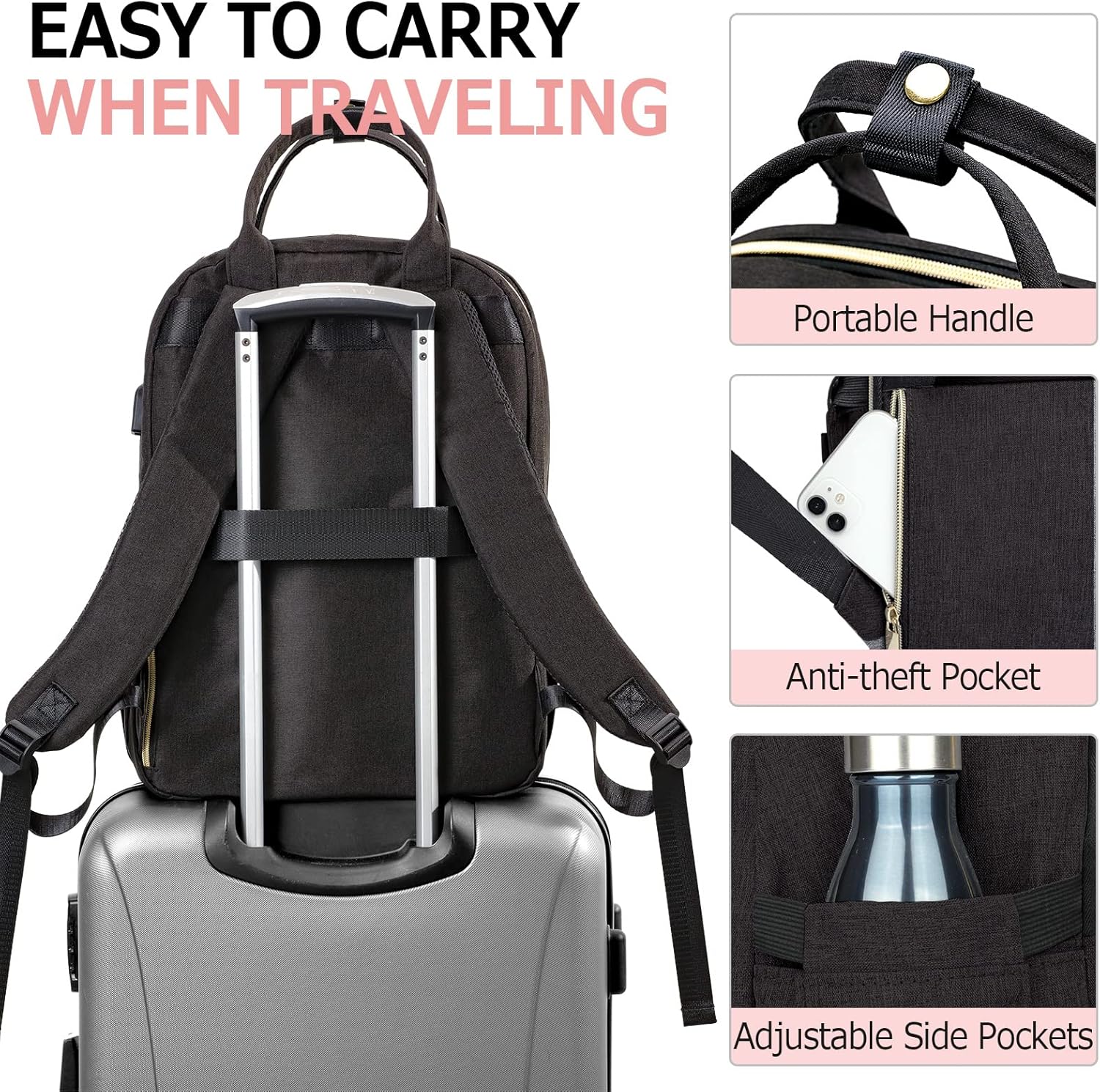 - Convenient Womens Backpack: The mesh shoulder strap design on both sides of the back pack allows enough air circulation around your shoulders, and sturdy top handles and luggage straps make it easy to carry. A fashion pretty black gold backpack designed for all-day comfort. The hidden anti-theft pocket on the back can protect your smartphone, wallet, passport and other valuables from being lost, for all basic daily needs for university, work, travel, hiking, business trips.