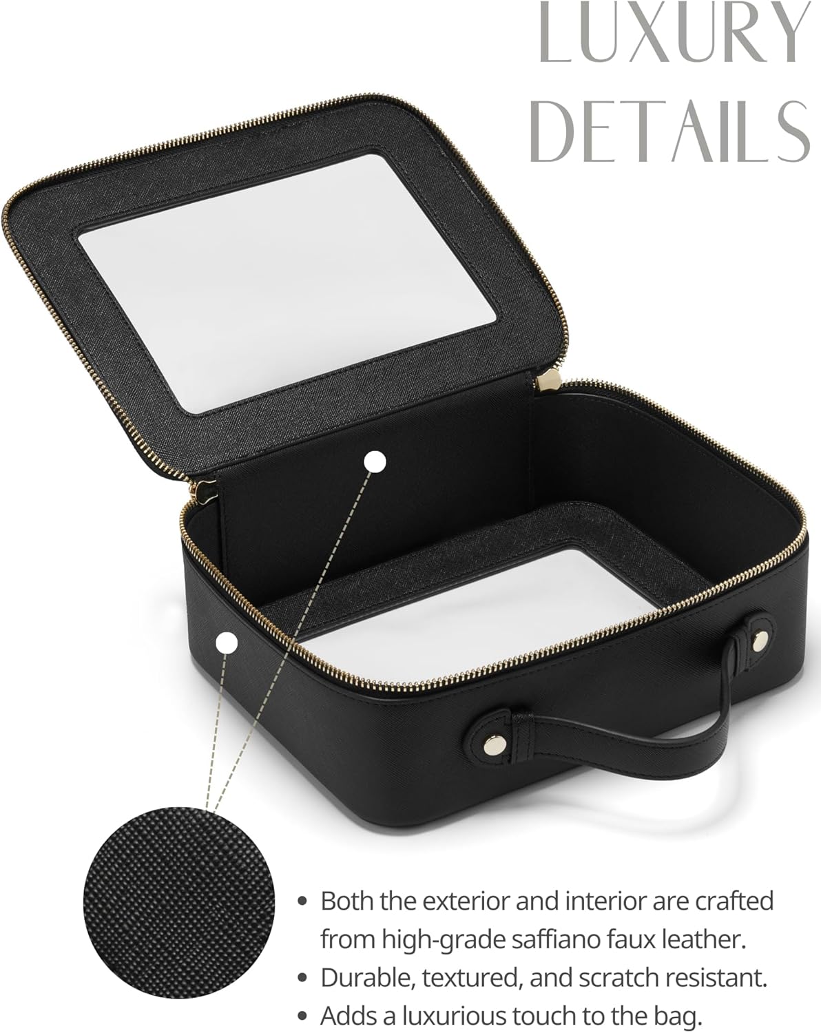- [Premium Material and Durability] – The clear cosmetic case, both the exterior and interior, is crafted from high-grade saffiano faux leather, which is highly scratch resistant, durable and exceptionally easy to keep clean. It features a smooth zipper for secure closure, and elegant light gold metal hardware accents, adding a luxurious and sophisticated touch to the bag's overall design.