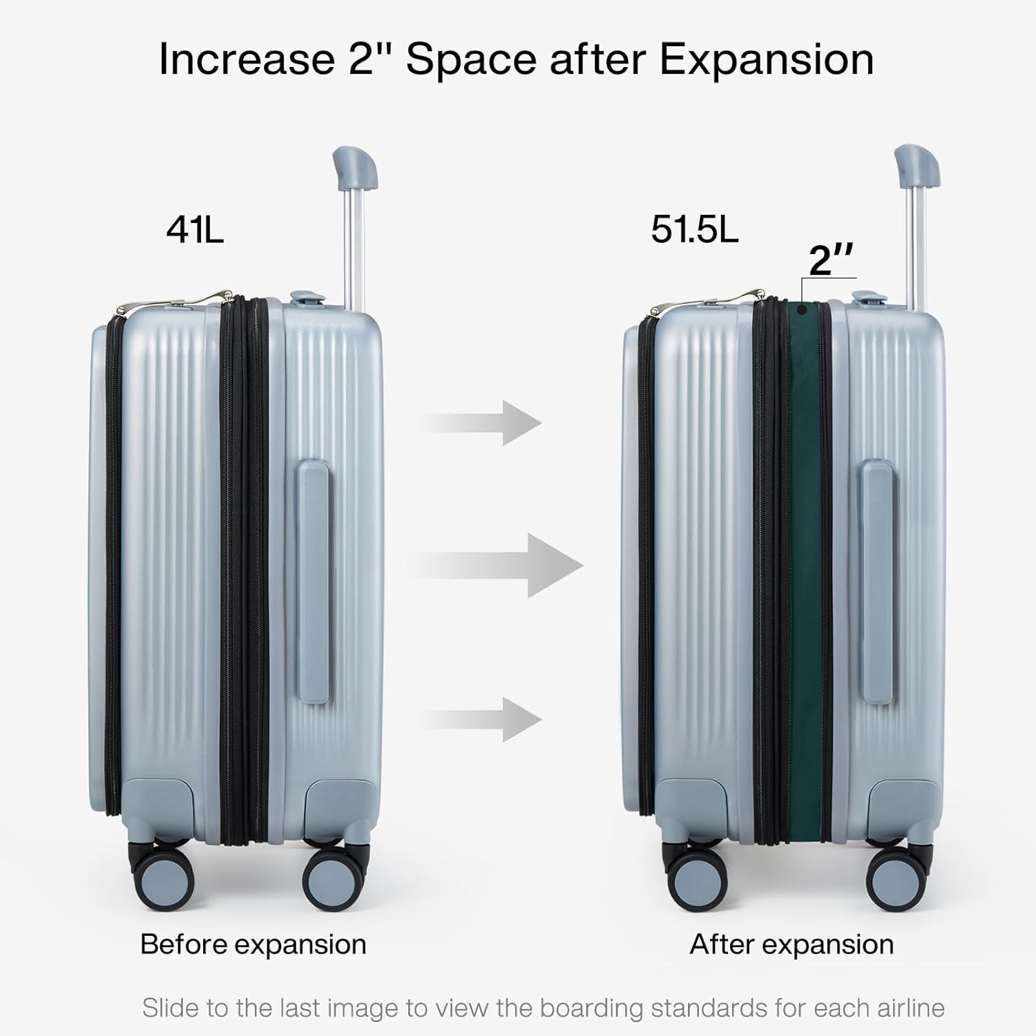 - 【Dimensions】This is a 20 inch expandable carry on luggage, L14.6 x W9.8 x H22.1 inches, 41L(after expanded 51.5L), 8.8LB. This hard case luggage is perfect for packaging laptops and other devices and accessories, and is suitable for overhead luggage.