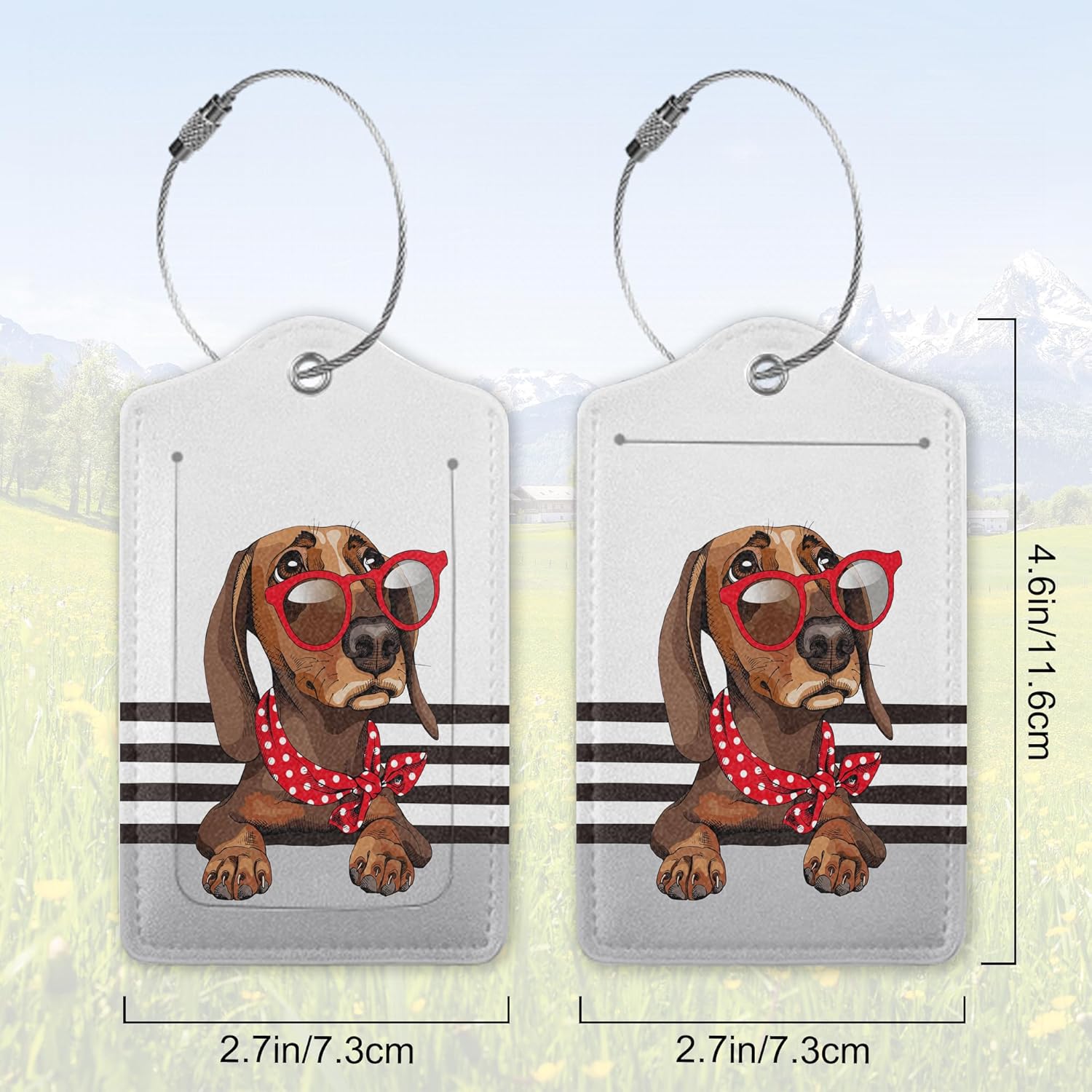 2 Pack Leather Luggage Tag for Suitcase Cool Dachshund Cute Animal Unique Travel Tags with Privacy Cover ID Label & Stainless Steel Loop for Men and Women Baggage