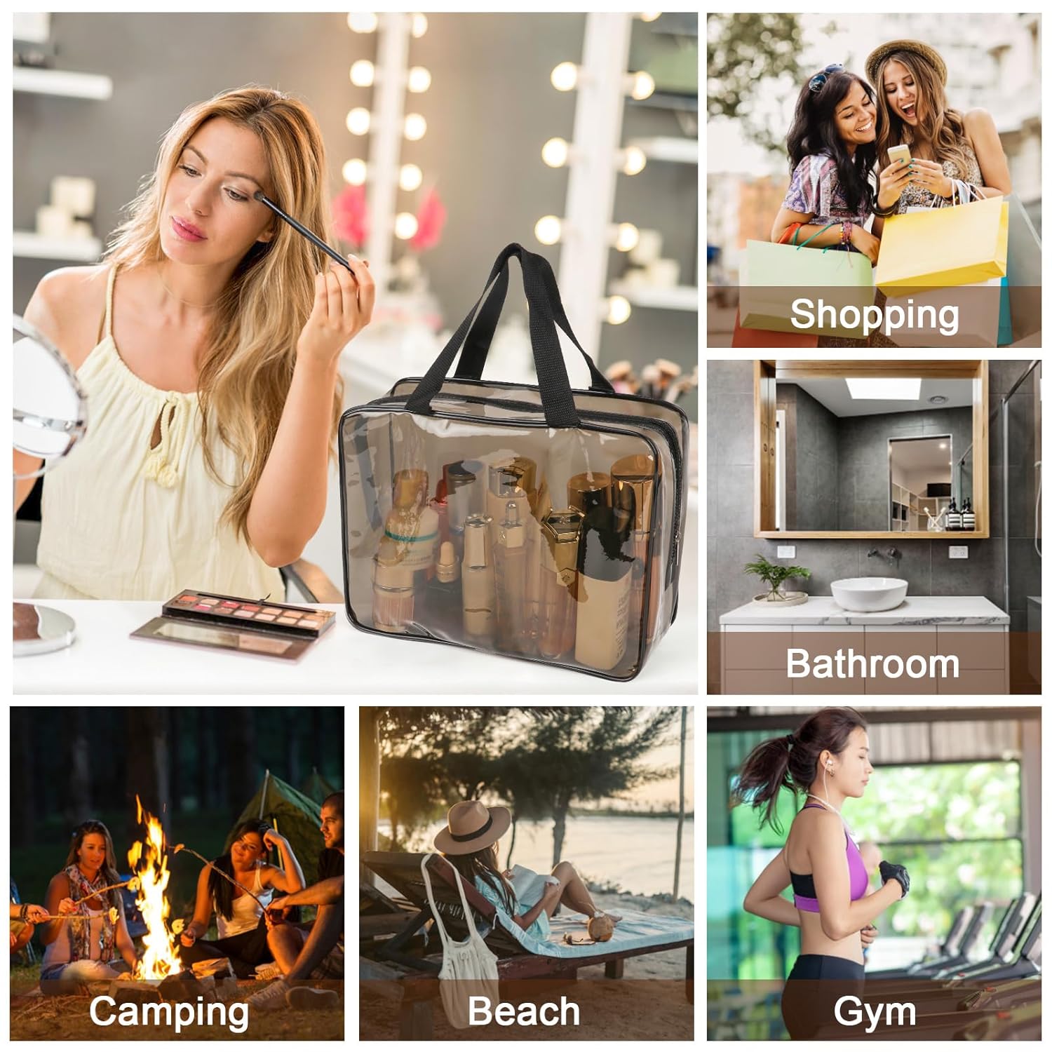- DIFFERENT SIZE: Includes 1 large (11.81" x 3.94" x 8.66"), 2 medium (8.66" x 1.96" x 7.87") and 3 small (7.08" x 1.57" x 5.51") clear makeup bags for organizing toiletries and cosmetics. Toiletry bag is suitable for travel, gym, bathroom organization