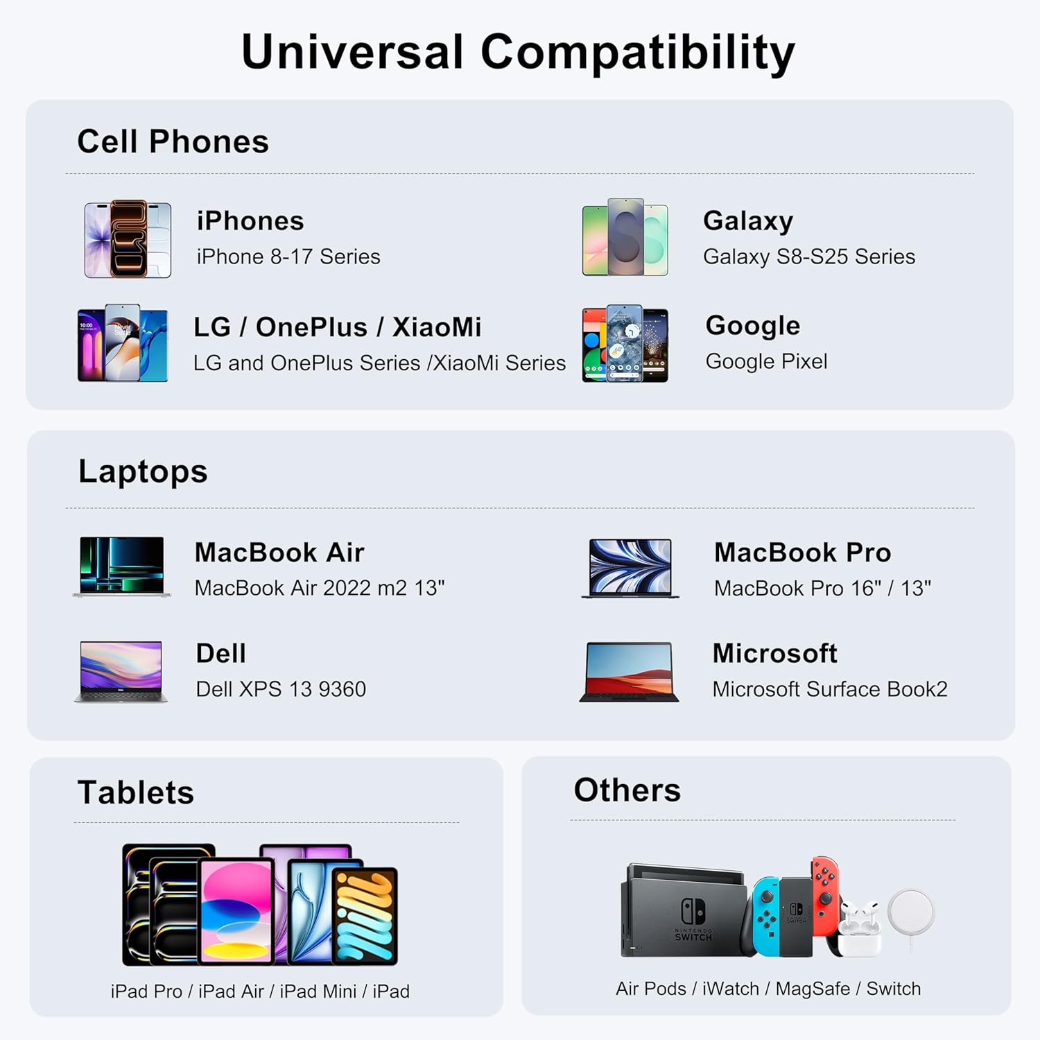 - âĄăUniversal CompatibilityăSay goodbye to your old chargers, this USB C charging station meets your daily charging needs. USB C Fast Charger Block compatible with MacBook Pro MacBook Air MacBook iPhone 17/17 Plus/17 Pro/17 Pro Max iPhone 16/16 Plus/16 Pro/16 Pro Max iPhone 15/15 Plus/15 Pro/15 Pro Max iPhone 14/14 PRO/14 PRO MAX/13/ 13 Mini/ 13 Pro/ 13 Pro Max iPhone 12/ 12 Mini/ 12 Pro/ 12 Pro Max/ XS/ XS Max/ XR/ X/ 11/ 11 Pro/ 11 Pro Max/ Samsung Galaxy S23 Ultra/ S22/ S21+/ S21/ S21 Ultra/ S21 FE/ S20+/ S20/Dell XPS 15/ 13 Google Pixel iPad Pro iPad Mini Series/ iPad Air Series AirPods Pro