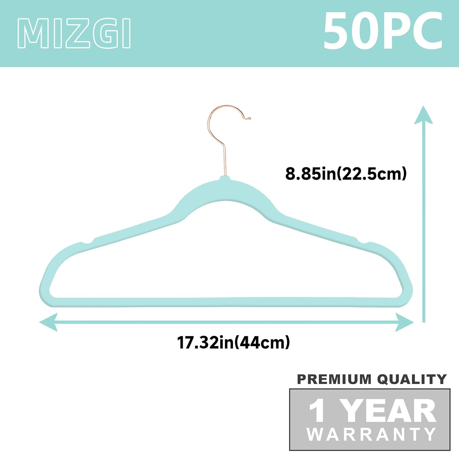 MIZGI Premium Velvet Hangers - Heavy Duty Non Slip Felt Hangers (50 Pack) - Aqua Blue & Rose Gold Hooks, Space Saving & Durable for Suits & Coats
