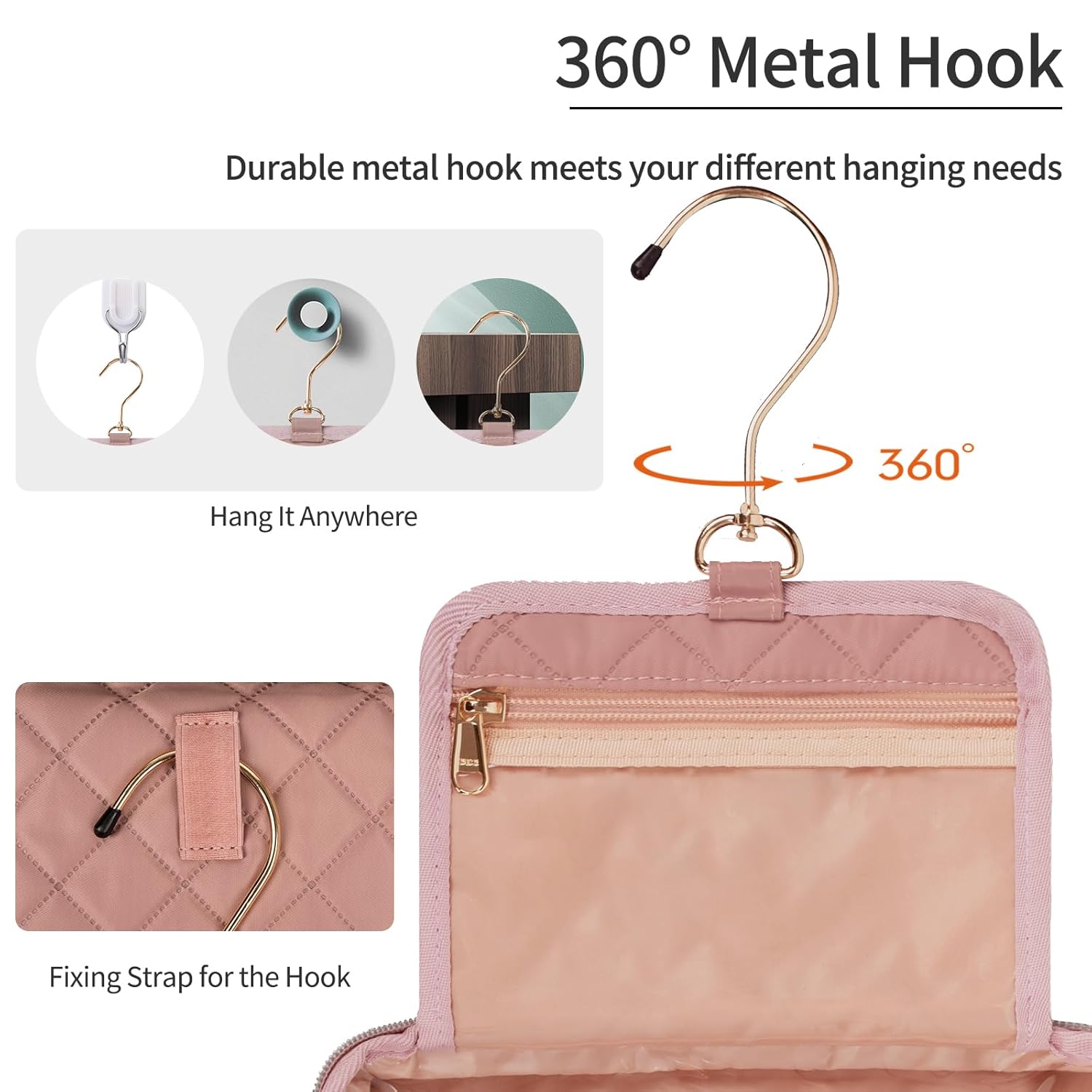 - CONVENIENT HANGING - The sturdy and durable metal hook is perfect to hang the toiletry bag anywhere so it doesn't take up a lot of counter space. Large diameter 360° swivel metal hook for versatile hanging options. It can even be hung on doors.