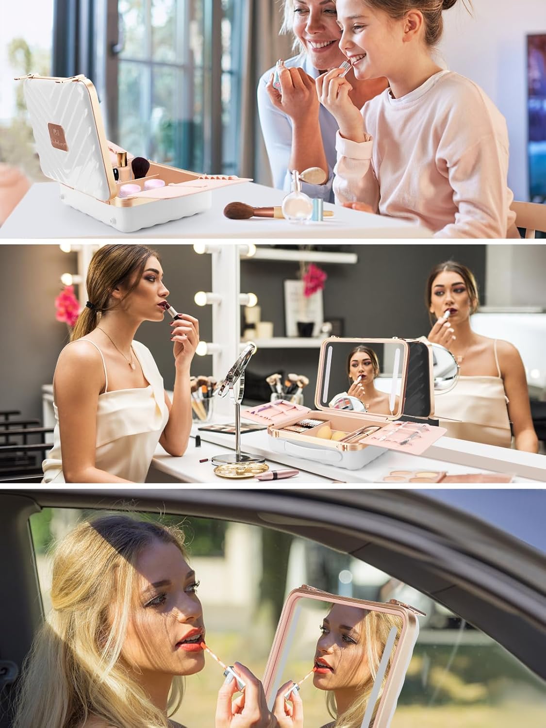 - 【4K Mirror with 3 Color Lights】Cosmetic case includes a 4k full-screen light mirror, which has 3 adjustable color light, gently touching the switch can easily adjust the color temperature between cold light, natural light and warm light, long press can adjust light brightness from 10% to 100%. Make sure that your makeup is absolutely color-correct and wonderful in anywhere. And the angle of the mirror is adjustable that allows multiple angle for easy makeup application.