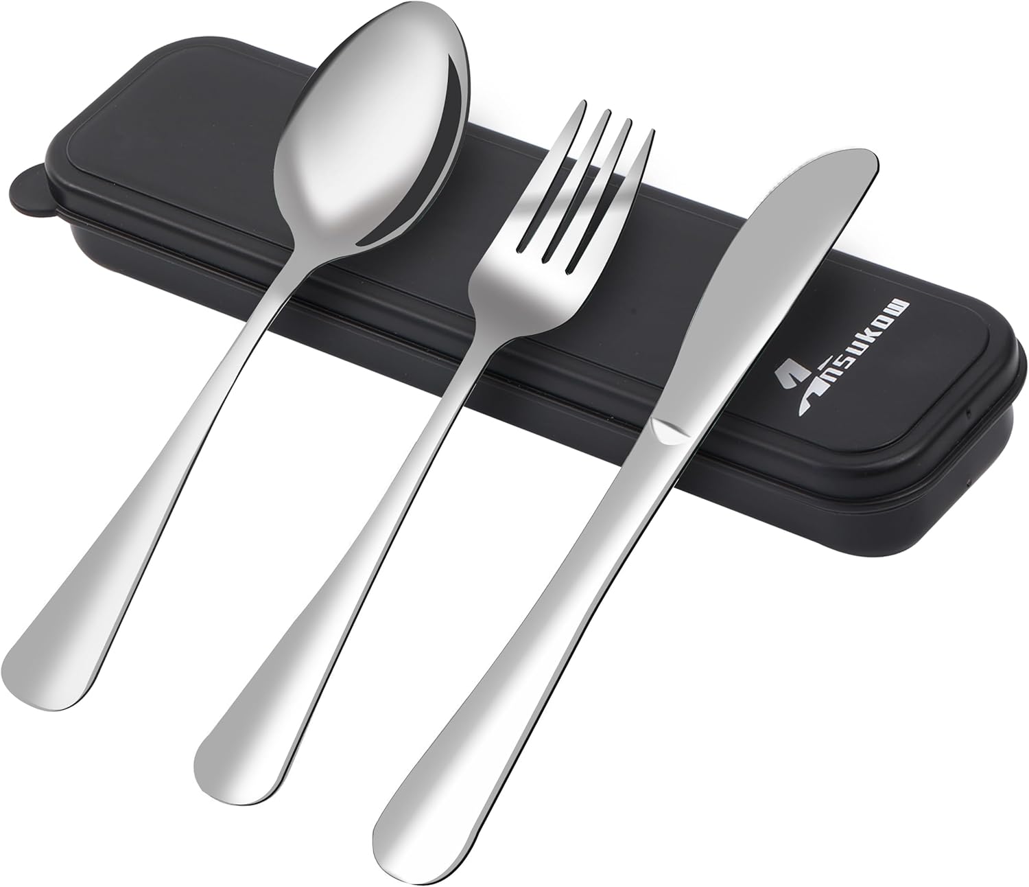 - 4-Piece Reusable Utensils with Case:Ansukow Portable Travel Silverware Set with include 1 X knife , 1 X fork, 1 X spoon, 1 X case