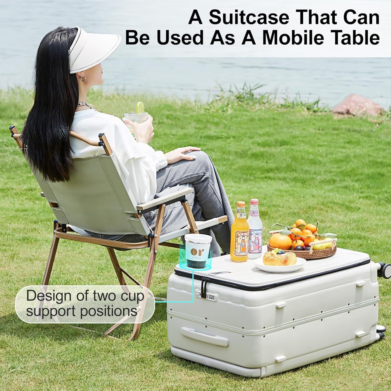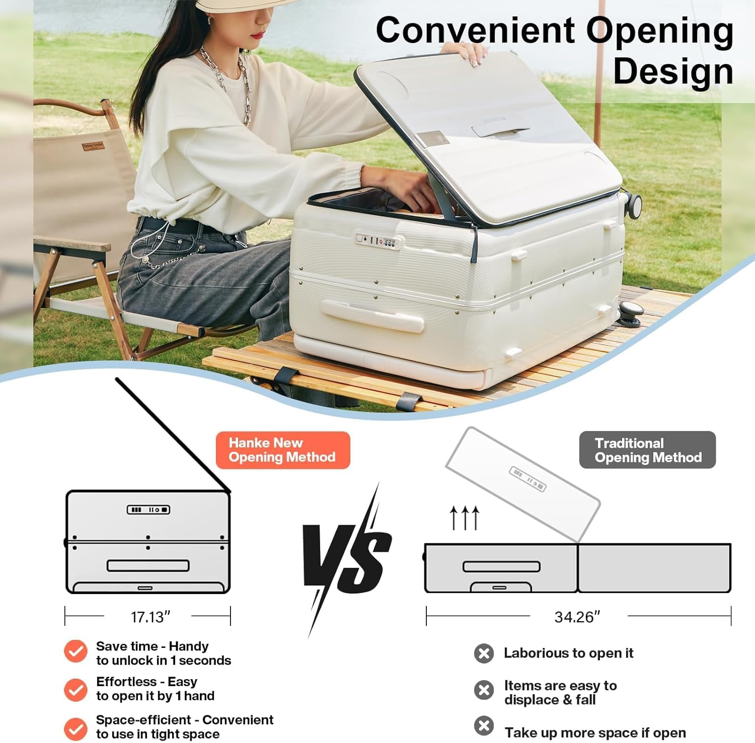 - 【CREATIVE FRONT OPENING】The trunk luggage with spinner wheels Leading the future opening and closing method which is effortless to open or close the suitcase, not only is it easy to load, but it also saves space. This design solves the problem that traditional luggage separated 2 compartments of heavy load then it's difficult to open and close. Importantly, it also avoid the displacement of items.