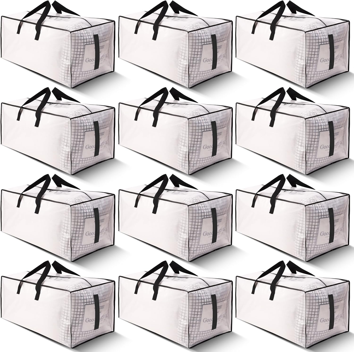 12 Pack Large Strong Moving Bags with Zippers & Carrying Handles - Water-Resistant - Heavy Duty Storage Tote for Space Saving, Fold Flat, Alternative to Moving Box (Semi-Transparent)