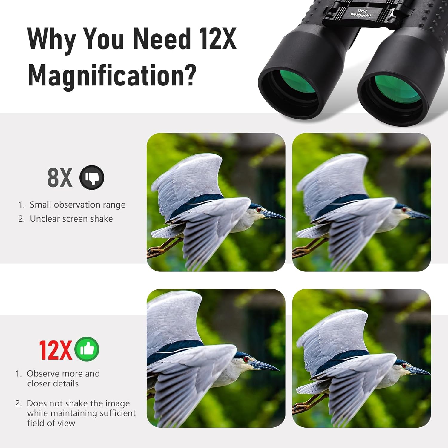 12x42 HD Binoculars for Adults, Professional Large View Binoculars with Clear Low Light Vision, Waterproof for Bird Watching, Hunting, Travel, Hiking, Sports, Concerts