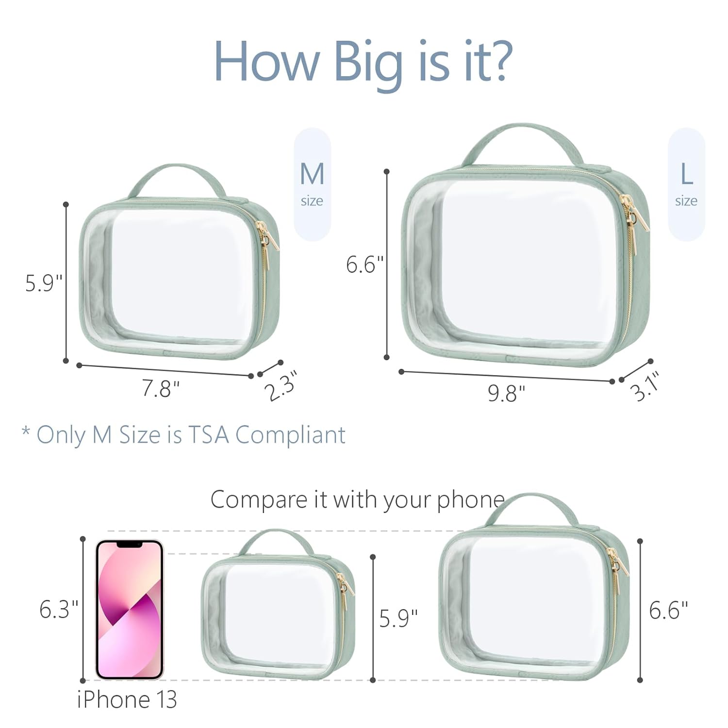 - TSA-approved & hassle-free security checks: This medium clear makeup bag measures 7.8 x 2.3 x 5.9 inches, perfectly complying with TSA’s 3-1-1 liquids rule and breeze through airport security without unpacking; note the large size clear bags for travel (9.8 x 3.1 x 6.6 inches) exceeds one quart and isn’t TSA-approved