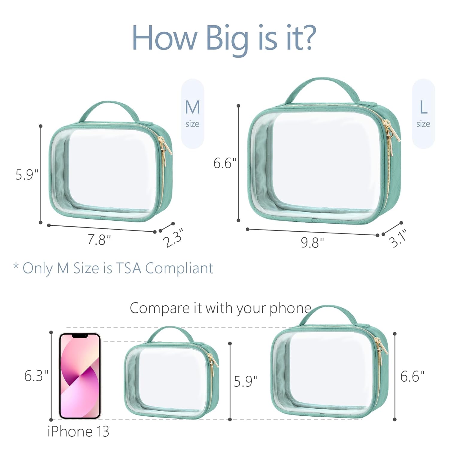 - TSA Approved, Meet Liquids Rule: The medium size clear makeup bag is 7.8 x 2.3 x 5.9 inch, it follows the TSA's 3-1-1 Liquid Rule published by TSA. You can quickly pass the airport security screening. Note: the large size clear bag is 9.8 x 3.1 x 6.6 inch, it is larger than one quart and is not TSA approved