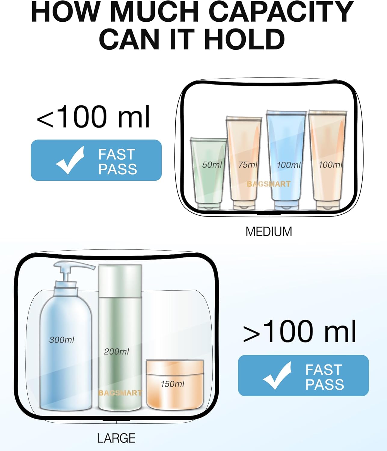 - Carry-on Size: The medium size is 8.2 x 2 x 6 inches, and the large size is 9.64 x 2 x 7 inches; The medium size travel toiletries bags strictly follows the TSA 3-1-1 liquids rule; With a TSA quart size travel bag, you can easily and quickly pass through security screening with it at the airport, saving your time and reducing stress