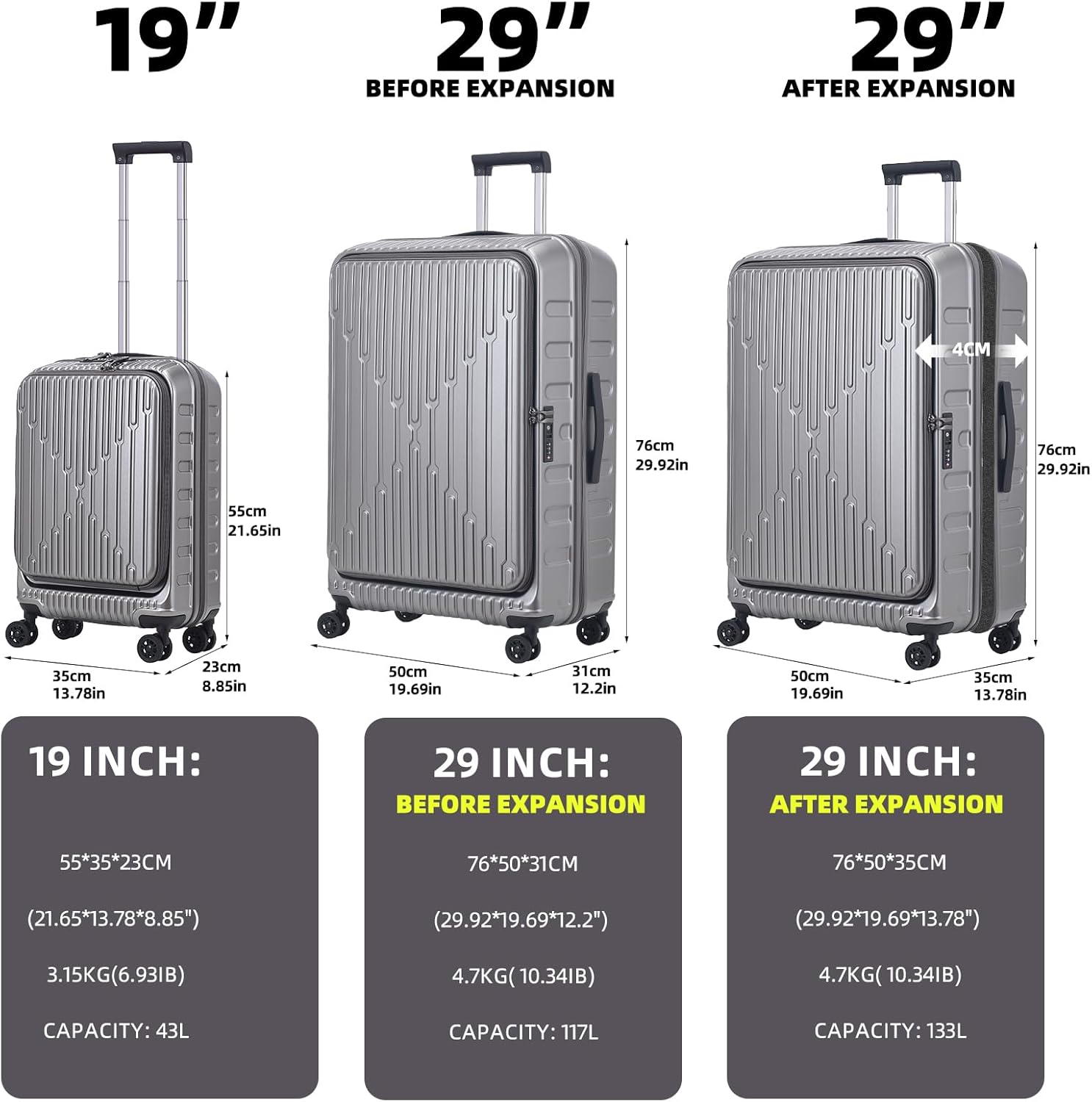 - 29 Inch=Large Size & Large Capacity: The 29 inch suitcase designed with the opening side, whcich increase 30% capacity than other same size luggage. Because the full side cover does not take up space, but the other middle zipper occupies 20% of the space for normal luggage. For the 117~133L capacity, you can take it go for a long trip or go abroad study.