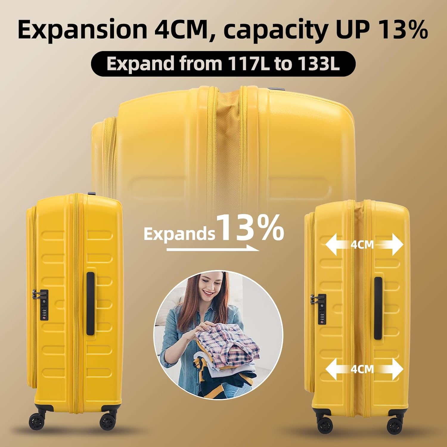29 Inch Luggage with Expansion & Side Opening Design, 50 * 31(35)*76cm, 117L~133L Ligthweight ABS+PC Hardshell Checked Suitcase, Yellow