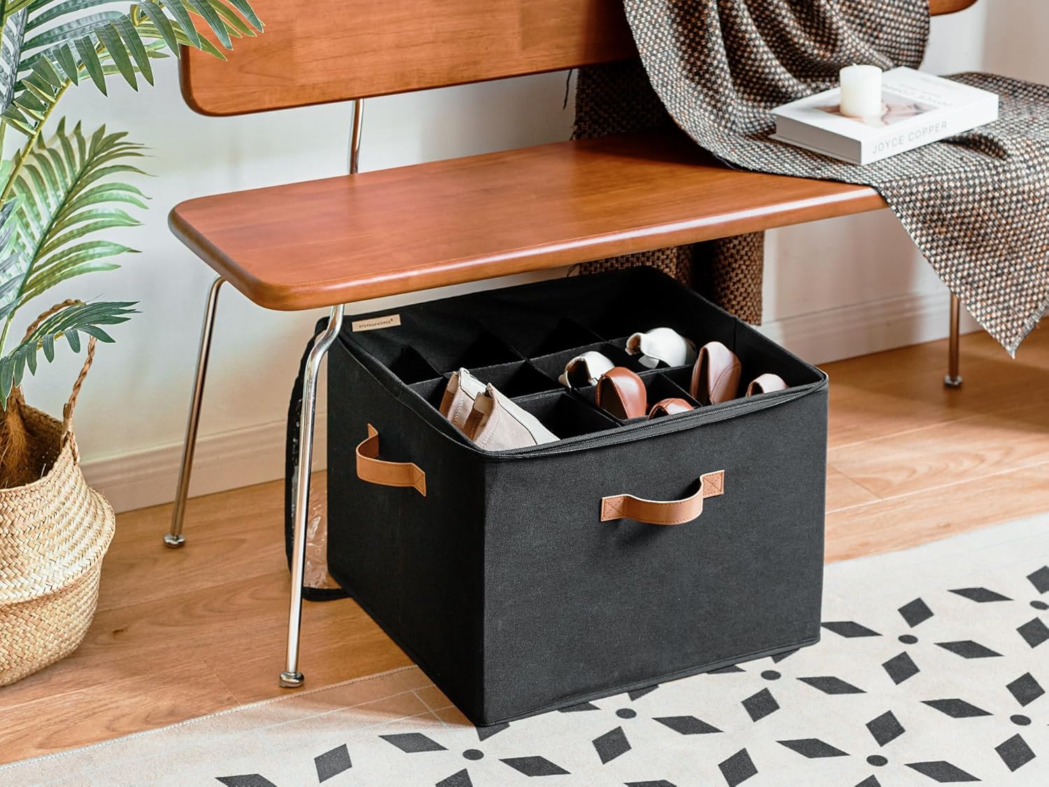 - The internal polypropylene dividers of this shoe storage organizer for closet are attached to the side panels, making it easy to customize the compartment sizes and keeping shoes securely in place during storage.