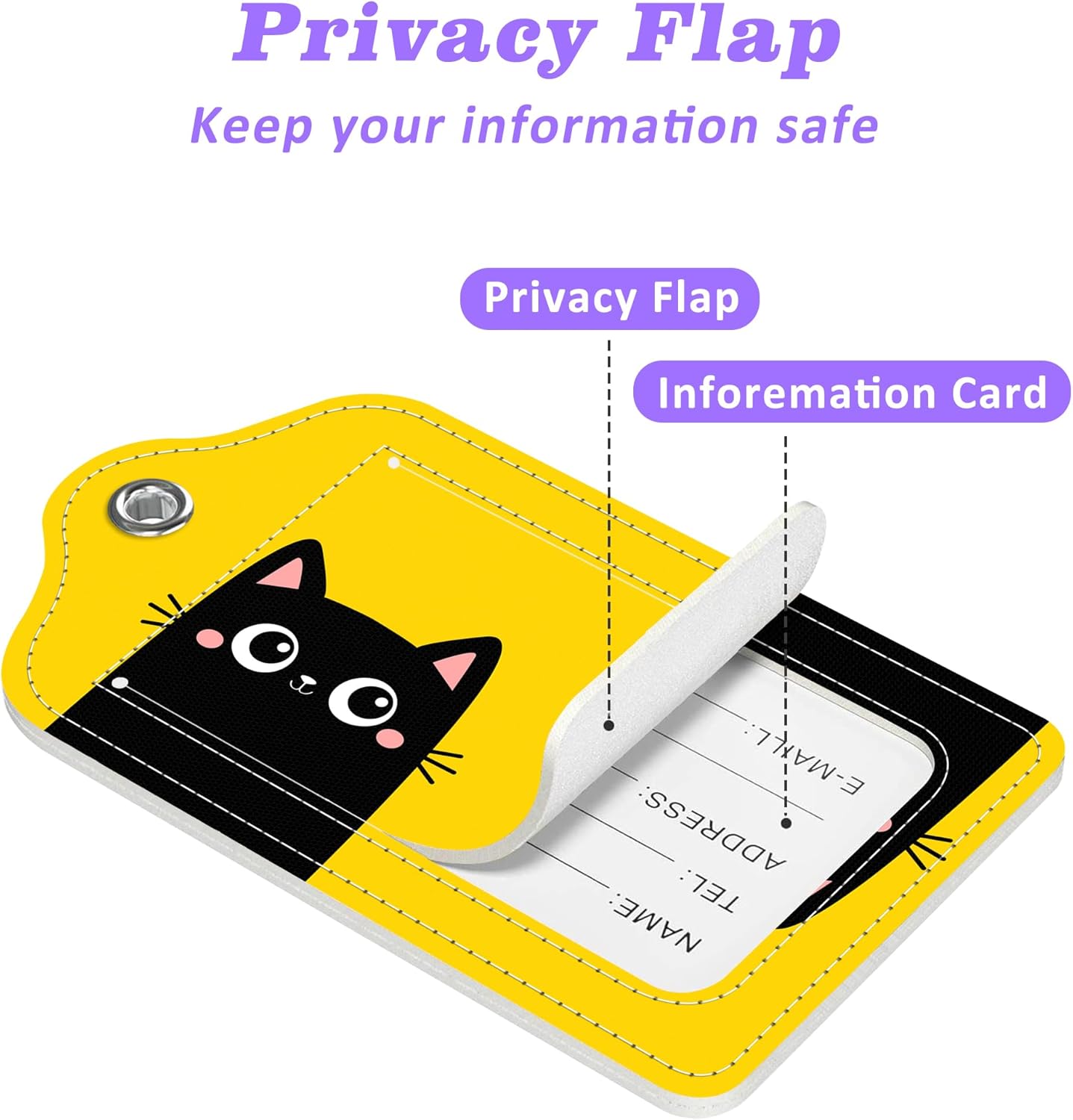 - Privacy Protection: Privacy protection id tags avoid prying eyes and increase security. The luggage tag is designed with a privacy back cover to protect your personal information from disclosure. Thanks to the transparent interlayer, there is no need to detach the tag and protects your information from the elements (rain, creases) while traveling