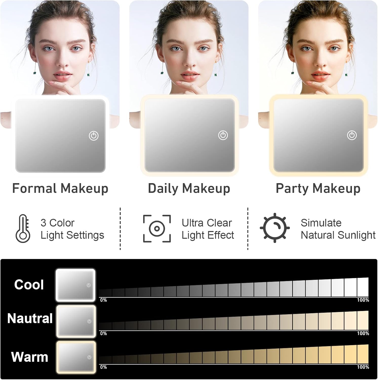 - 【Makeup Mirror with Fill Light】Travel makeup bag includes a 9.06*7.88 inch full-screen light mirror. Long press the switch to adjust light brightness from 0% to 100%, and gently touch the switch to easily adjust color temperature between cold light, natural light and warm light. Built-in 2000mAh rechargeable lithium battery, according to the daily makeup time of 30 minutes, a single charge will last about a week.