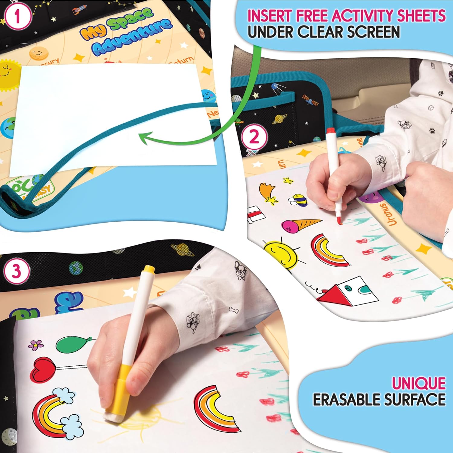 - Let Kids Play & Learn - Our car seat tray for kids travel comes with 2 activity sheets and 4 erasable markers along with 20 downloadable sheets so your little one can draw, play and have fun while providing them with a multipurpose car trays for eating, writing, drawing, preschool activities and more. It doubles as a car tray for toddler travel activities and plane activities for kids ages 3-5, making it travel essentials kids will love!