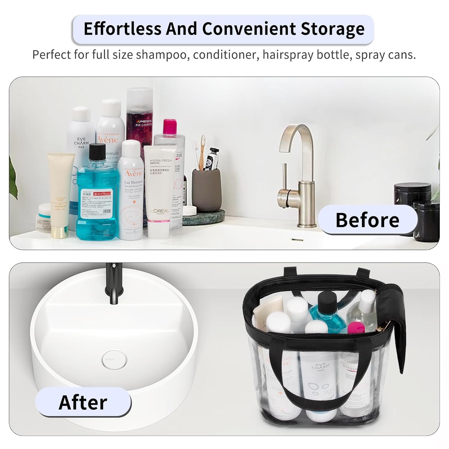- 【Large Capacity】Size of clear toiletry bag is 8.3*5.3*10.6 inch, enough for hold your travel essentials and daily necessities, including full-size shampoo bottles, conditioner, spray cans, hairspray, body wash, shaver, toothbrush, comb, towel, cosmetics and more.