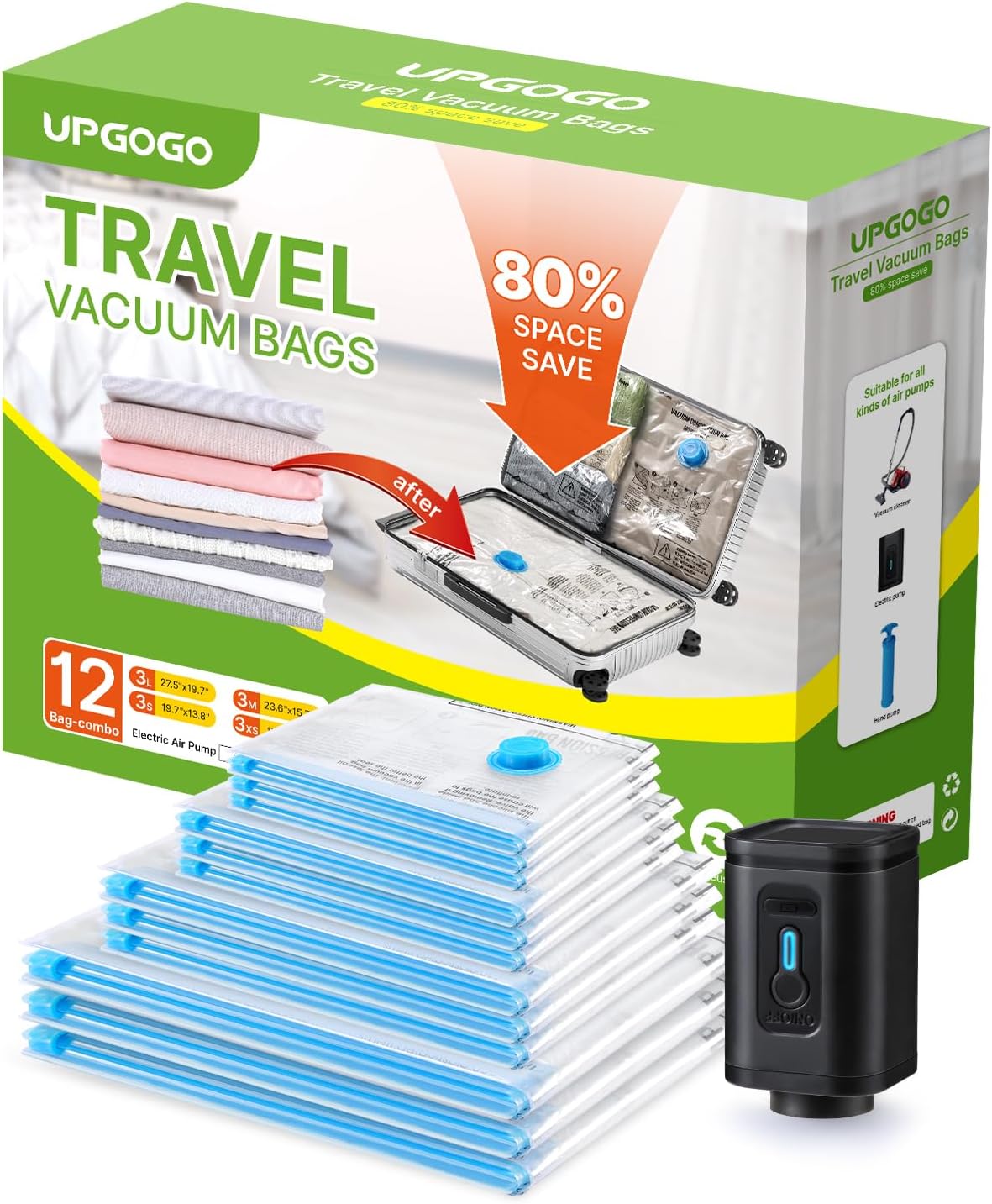 Combo 12 Pack Travel Vacuum Bags with Portable Electric Pump, Space Saver Vacuum Storage Bags for Clothing and Luggage, Travel Essentials