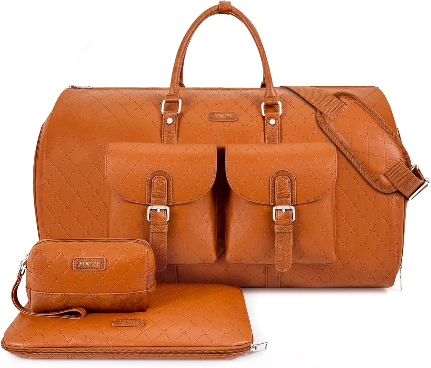 - WATERPROOF SHOES POUCH - This garment duffel bag work perfect as a 56L duffel bag/travel weekender bag after assembled. The left side pocket of this leather garment bag is a waterproof PVC lined shoes pouch can hold up to 2 pairs shoes, wet/dirty clothes, wash bags or other things you want to store separately, keep other things in weekend bag clean and tidy. The right side pocket is designed for passport, keys and some other small items. Extra front 2 pockets for quick access.