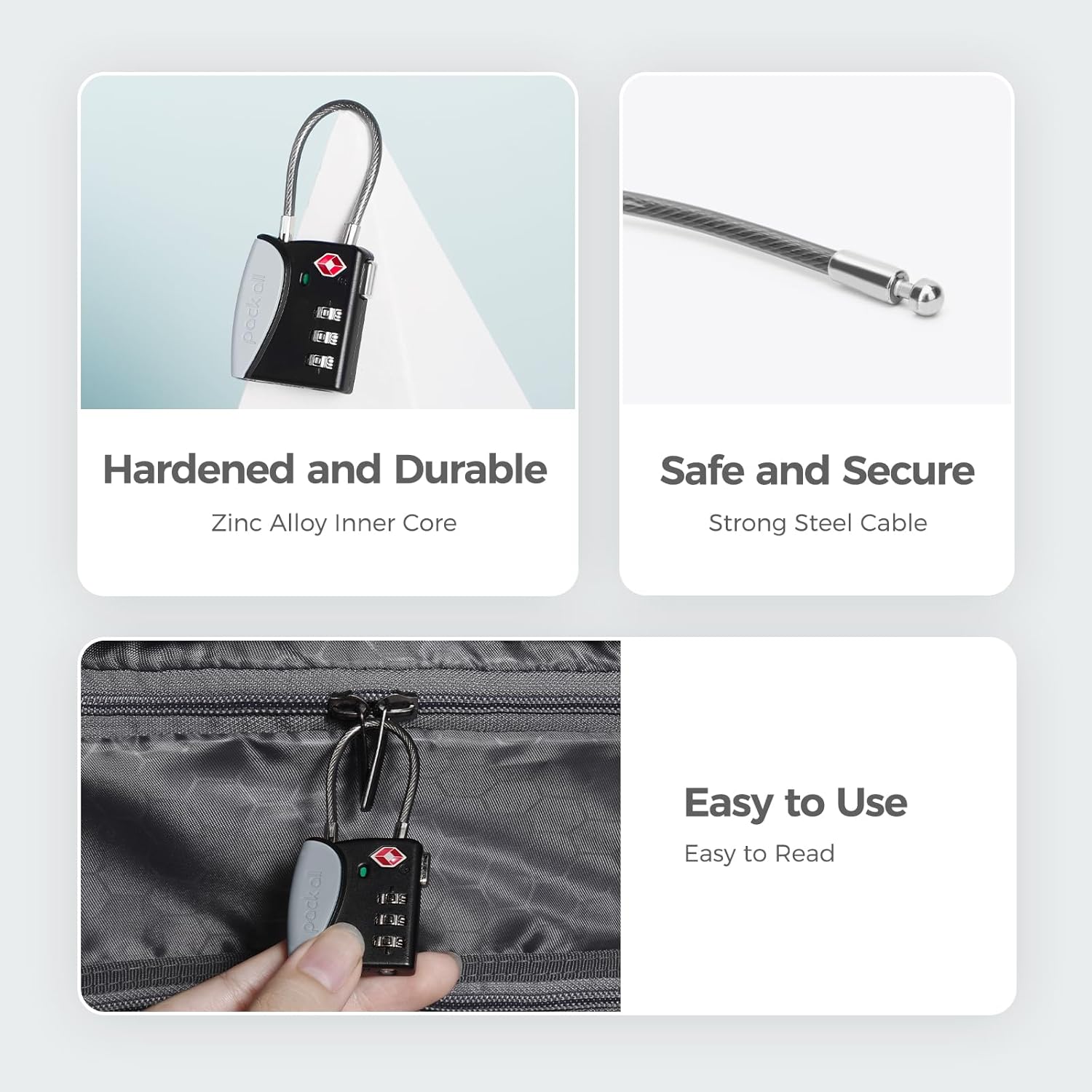pack all TSA Approved Cable Luggage Locks, 3 Digit Combination Padlocks, Travel Lock for Suitcases & Bag, Alloy Body, Travel Accessories (4 Pack)(Grey)