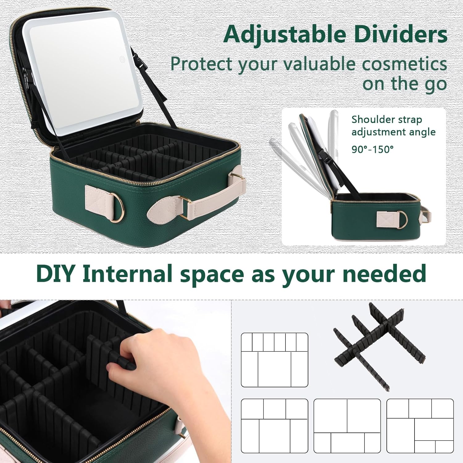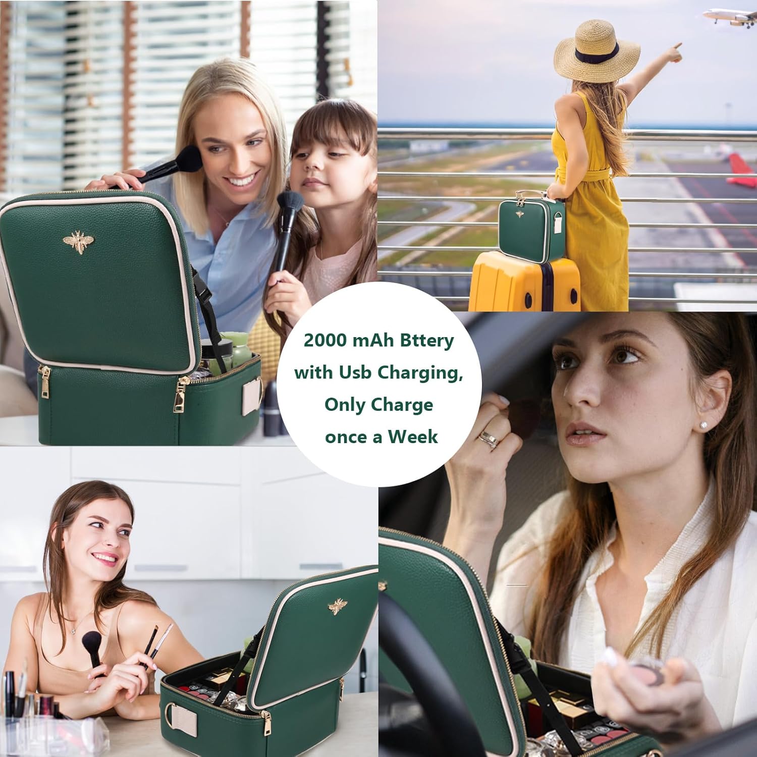 Travel Makeup Bag with Mirror of LED Lighted, Rechargeable Cosmetic Train Case Artist Makeup Organizer for Women with Adjustable Dividers, Makeup Brushes Holder and Strap (Green)