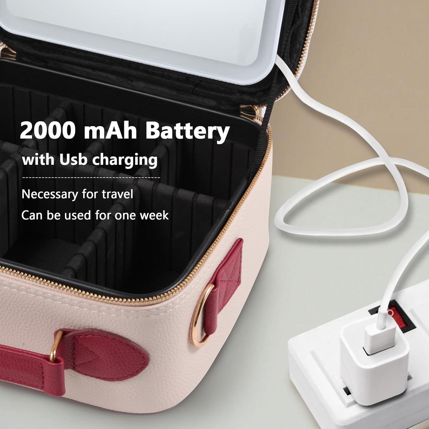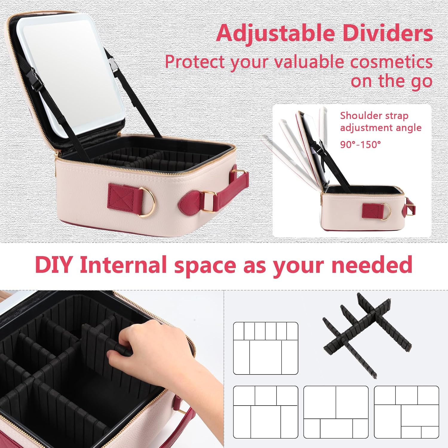 - 【Perfect Gift Choice for Women】Travel makeup case with LED Lighted is a perfect gift for your wife, girl friend, mother, makeup lovers in any special days, such as mother's day, birthdays, valentine's day, Halloween, anniversaries, Christmas. It can not only store lipsticks, makeup brushes, eye shadows, skin care products, etc., but also jewelry, cameras and so on. Delivered package includes a makeup bag, a mirror, a charging cable, a shoulder strap, a brush storage board, an instruction manual.
