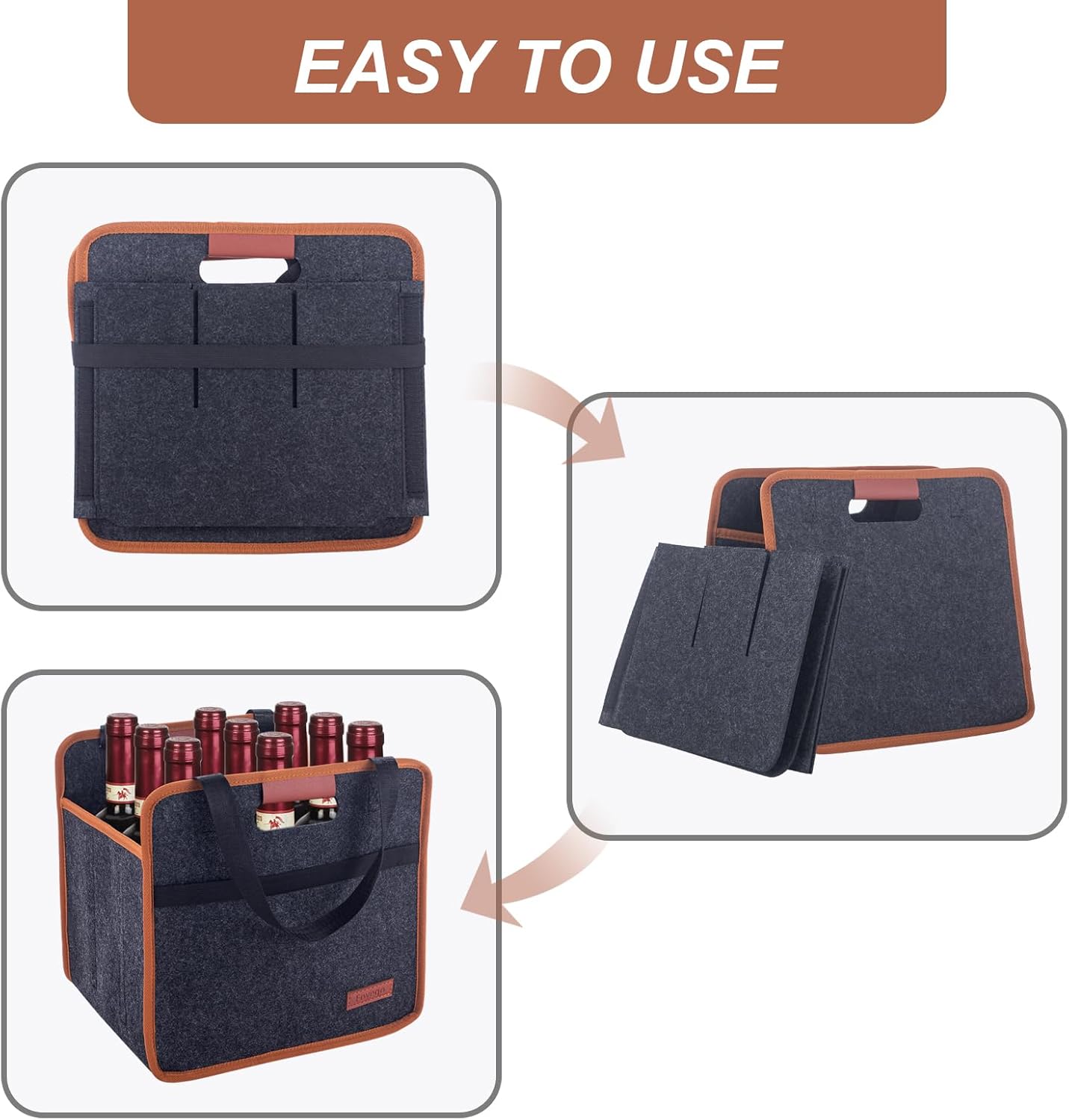 - đˇăHIGH-QUALITY WINE CARRIERă: Wine tote bags for 9 wine bottles are made of beautiful and durable high-quality felt. Different from other products on the market, special edge treatment is performed around our wine carrier, which is stronger and prettier. The strong handle, thick padded & thermal insulated material and handheld straps make it the perfect wine carrier for outdoor activities.