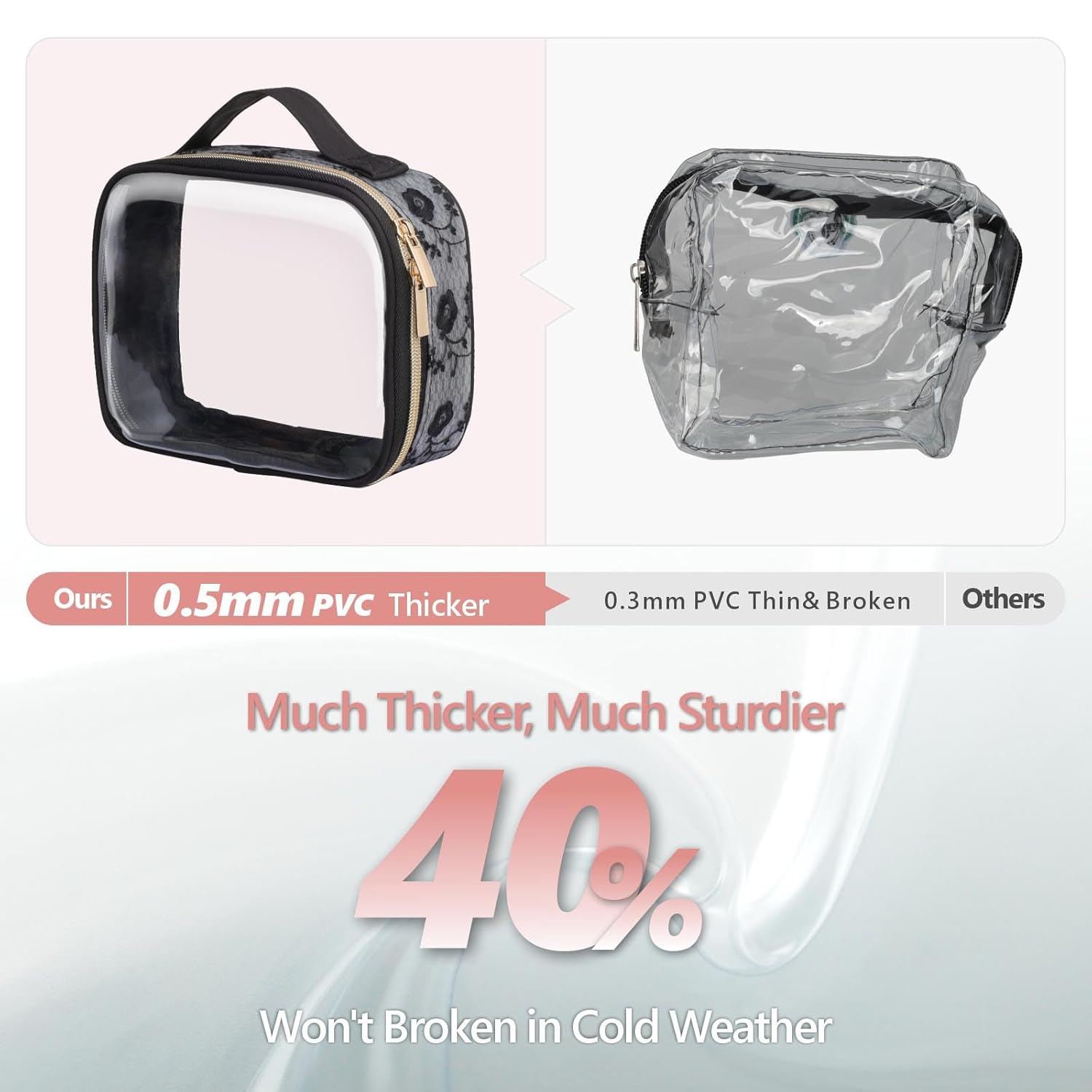 PACKISM Floral Texture Lace TSA Approved Toiletry Bag - 180° Large Opening Clear Makeup Bags in 2 Size, Clear Cosmetic Bags with Handle, 0.5 mm Thick Non-deformable No Smell, Black