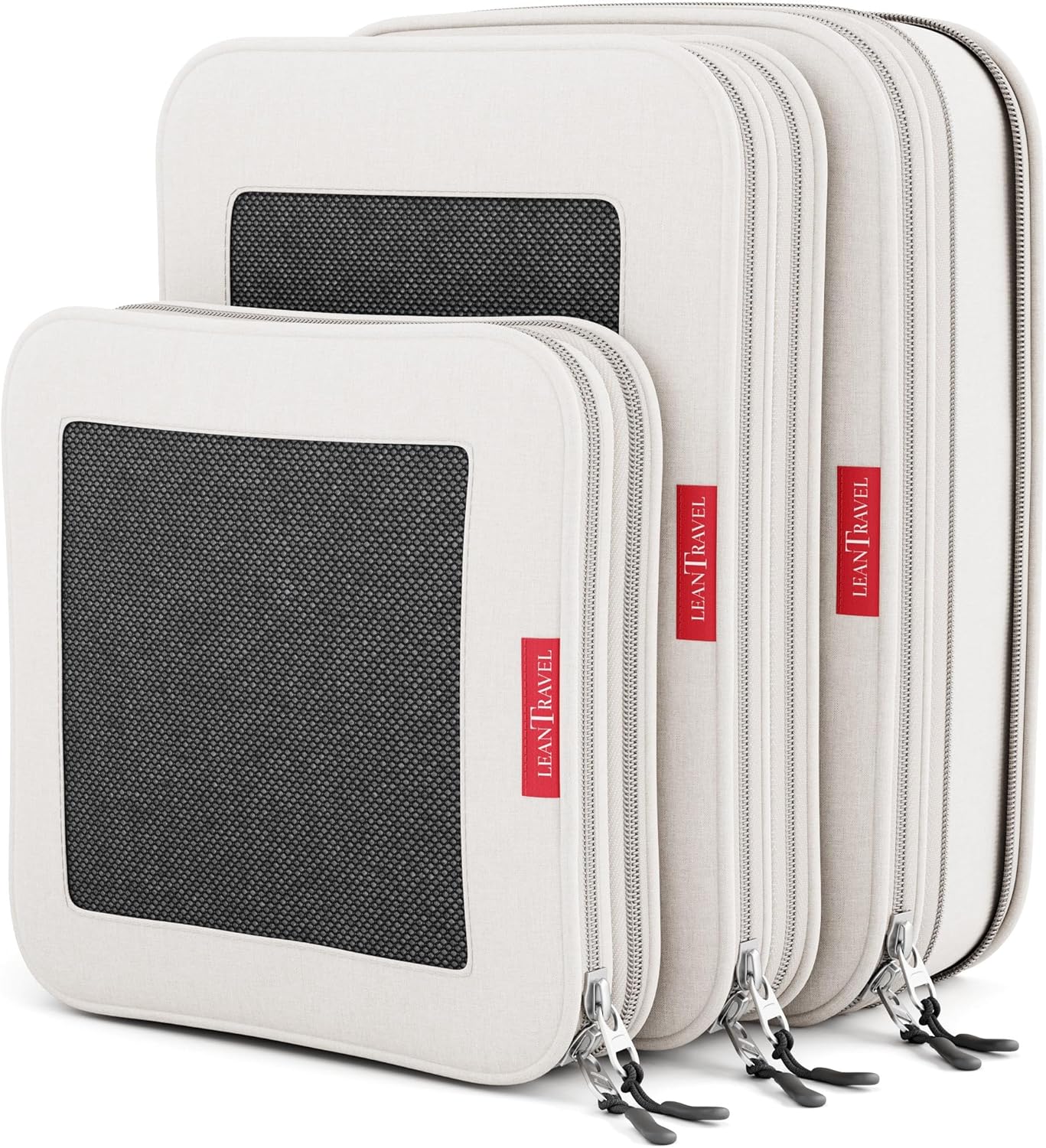 LeanTravel Compression Packing Cubes for Travel Organizers with Double Zipper (3-Pack (2L+1M), Sand)