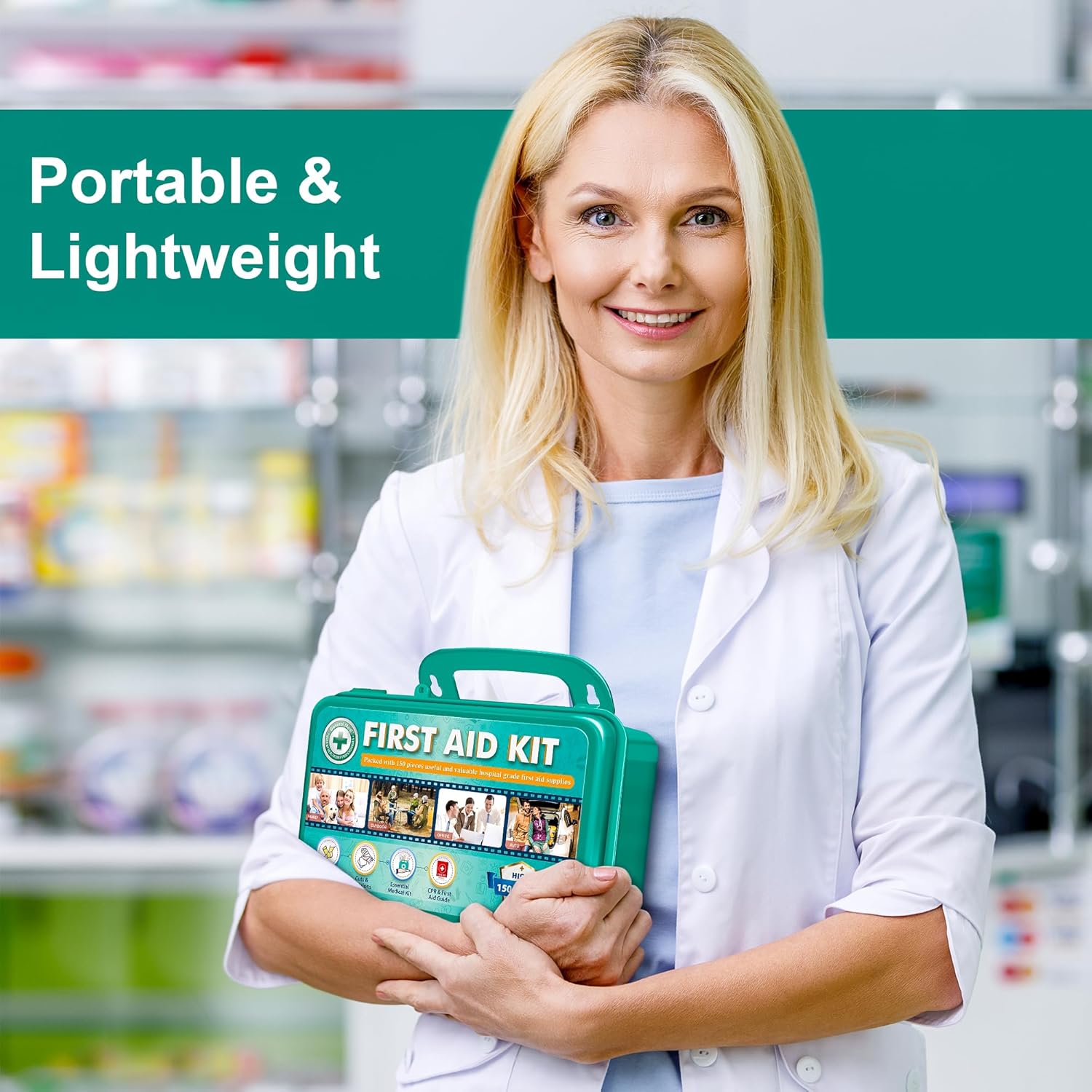 - Quality - The box is hard case, compact and easy to carry, holds all the basic first aid supplies (150 pieces total). It is well-organized and there is still additional space to add more items when necessary.