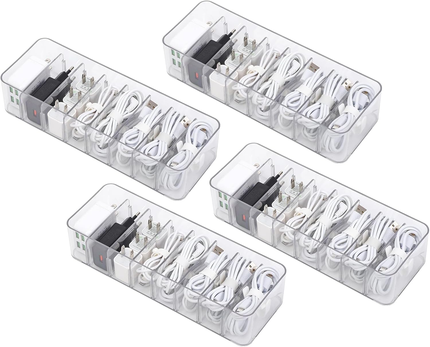 Yesesion 4 Pack Cord Organizer Box with 40pcs Wire Ties, Plastic Charger Storage Case with Adjustable Dividers for Desk Drawer, Home Office Supplies, Stationery, Data Cable, USB, Battery Holder