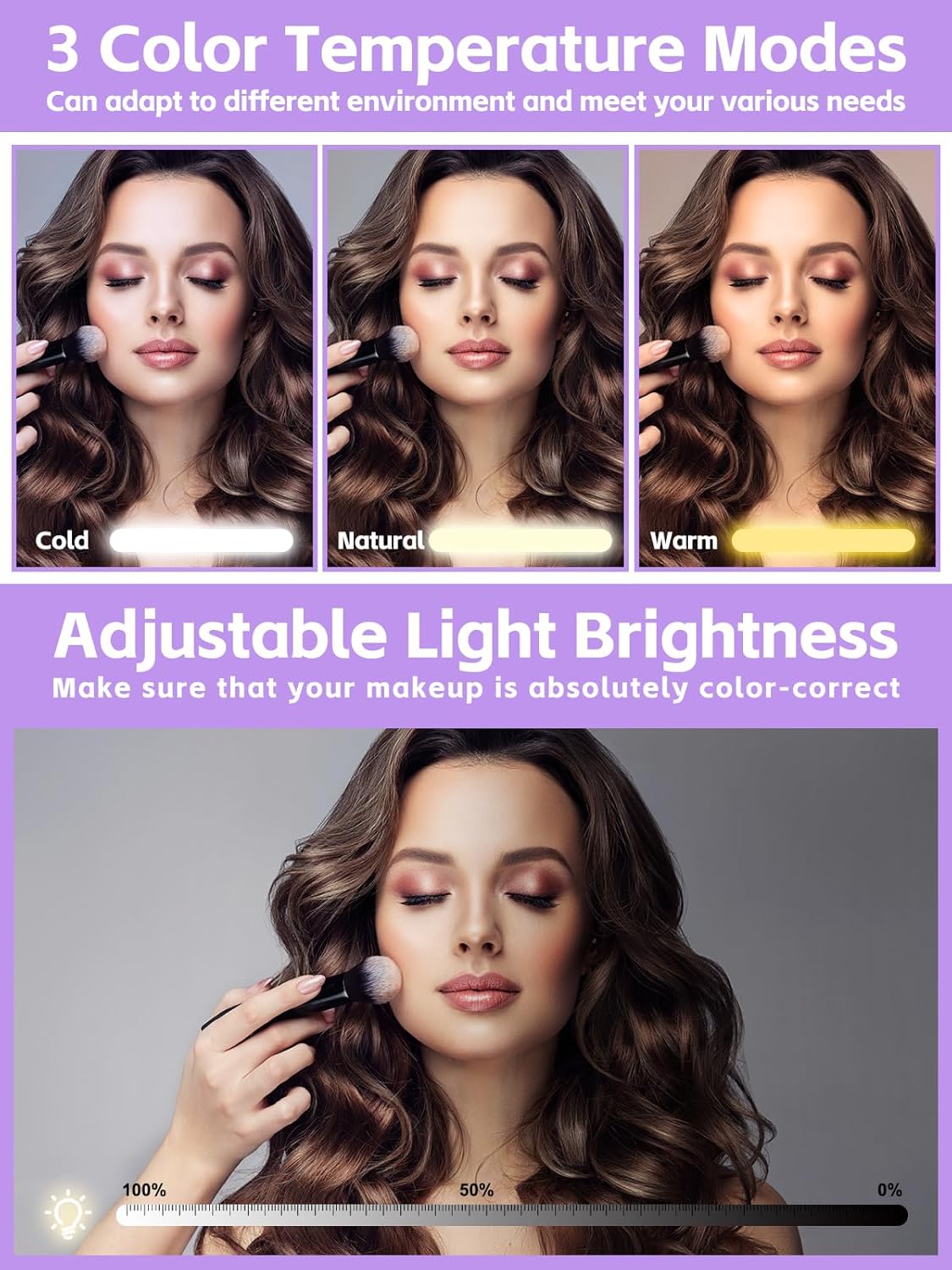 - đă4K Mirror with 3 Color LightsăKalolary cosmetic case features with a 4k full-screen light mirror, which has 3 adjustable color light, gently touch the switch can easily adjust the color temperature between cold light, natural light and warm light, long press can adjust light brightness from 10% to 100%, giving you color-corrected, flawless makeup application every time. And the mirror angle is also adjustable allows multiple angle for your convenience.