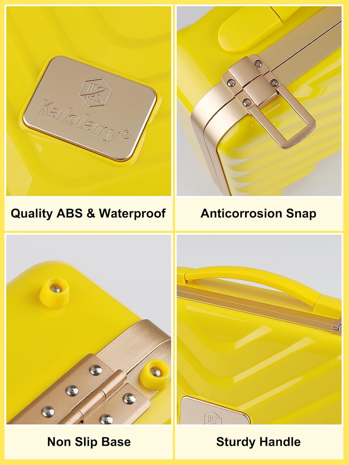 Kalolary Travel Makeup Train Cases with Lighted Mirror 3 Color Setting, Makeup Bag Cosmetic Case Organizer Adjustable Brightness Portable Makeup Storage Box with Detachable 5X Magnifying Mirror Yellow