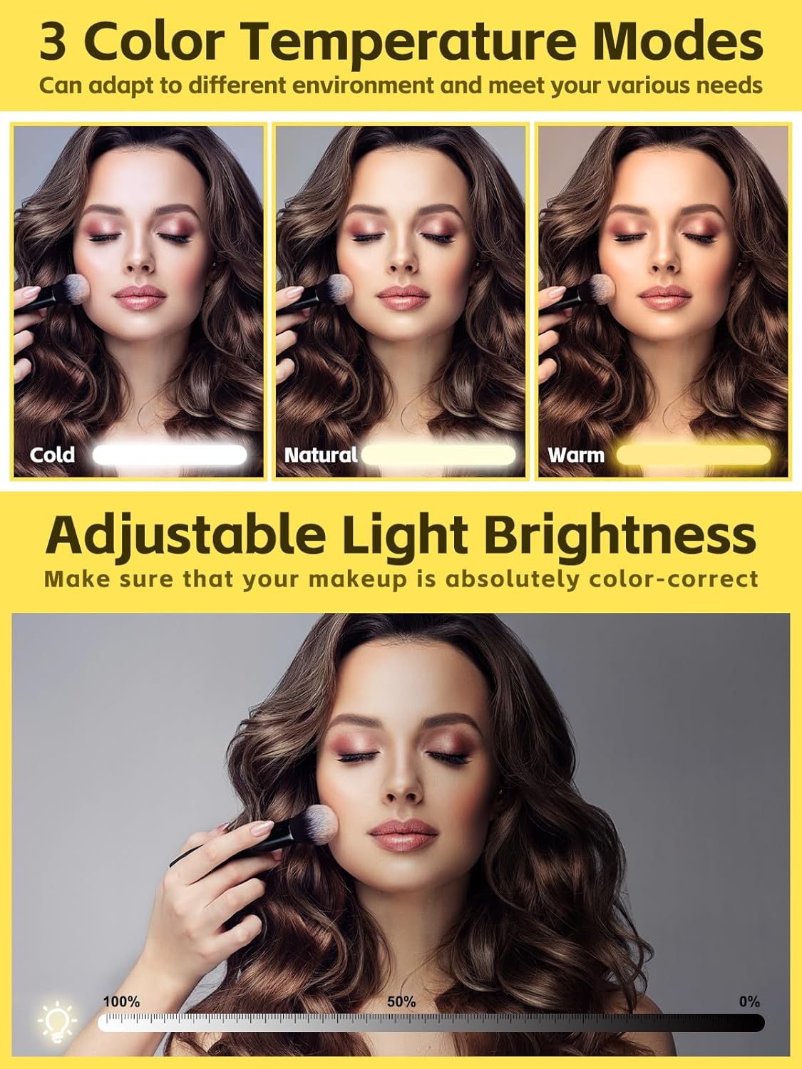 - đă4K Mirror with 3 Color LightsăKalolary cosmetic case features with a 4k full-screen light mirror, which has 3 adjustable color light, gently touch the switch can easily adjust the color temperature between cold light, natural light and warm light, long press can adjust light brightness from 10% to 100%, giving you color-corrected, flawless makeup application every time. And the mirror angle is also adjustable allows multiple angle for your convenience.