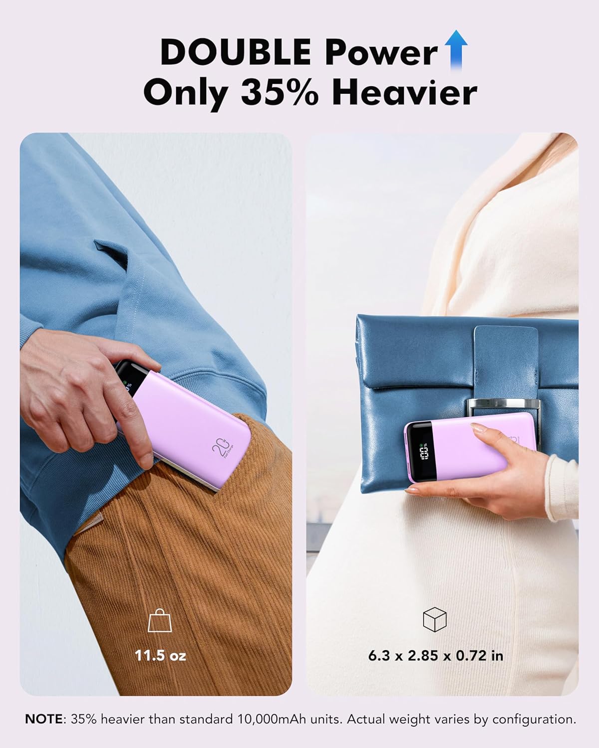 - 🔋【Double the Power, Only 35% Heavier】Battery pack 20,000mAh (2X capacity of standard chargers) in just 6.3 x 2.85 x 0.72 in - only 35% heavier than 10K models but holds twice the energy. Fits anywhere a paperback book would.