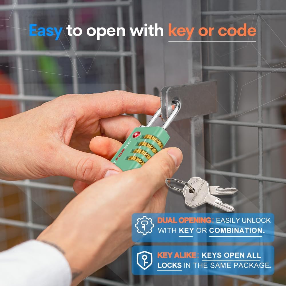 Forge Dual-Opening: Key or Combination Access Lock, TSA Approved Locks for Luggage, Pelican case, Travel, Gym, School, Stainless Steel Shackle. (Green, 4 Pk)